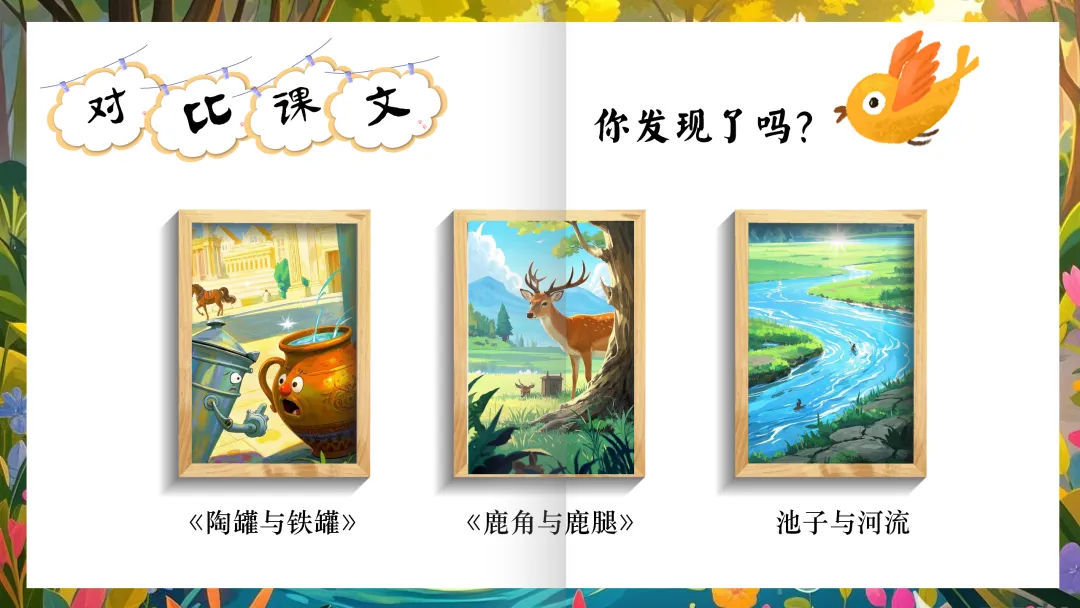 师:其实,寓言故事的特点还不仅如此,在写作技巧方面,寓言故事中会经常采用“对比”的方式去写。本单元所学习的几篇寓言故事中就有所体现,比如在《陶罐与铁罐》中,铁罐的傲慢与陶罐的谦逊形成鲜明对照,这一对比深刻揭示了谦逊与傲慢的不同结局。在《鹿角与鹿腿》中,鹿角与鹿腿的功能对比,生动展示了实用与美观的价值差异。在《池子与河流》中也有对比,我们一起去看看。(板书:对比)