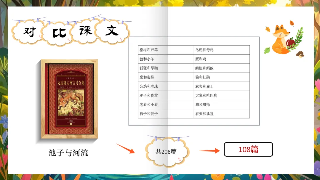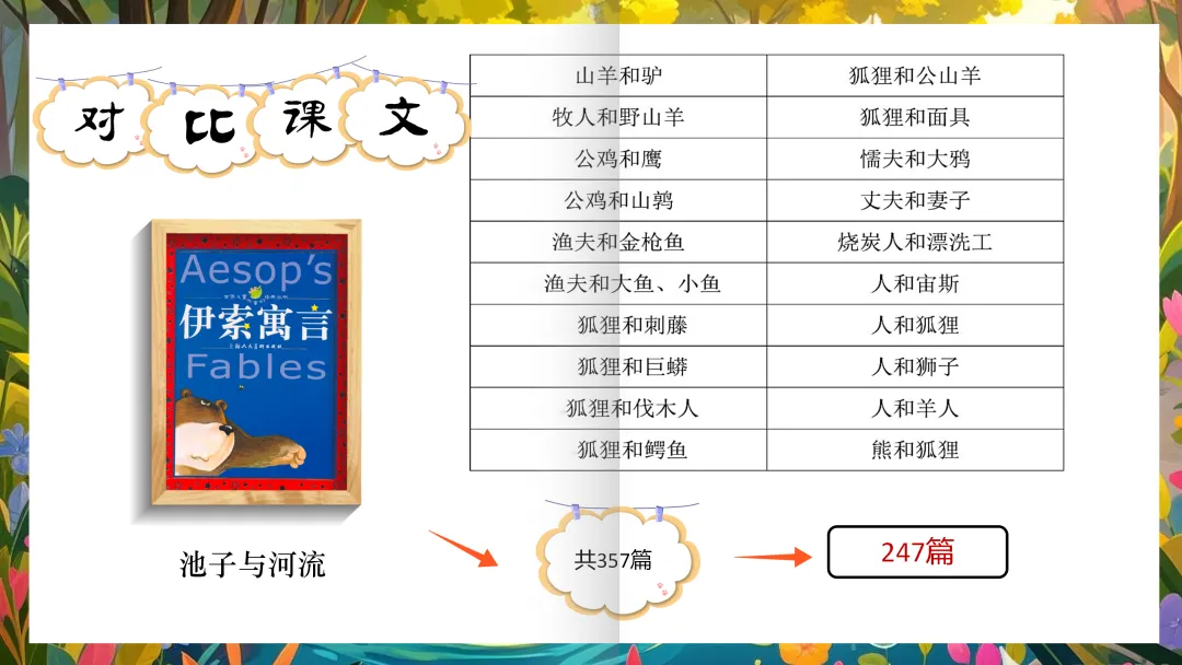 师:比什么呢?咱们来比课文!(PPT出示:比课文)这个单元有三篇是外国的寓言,请你比一比,有什么发现?
