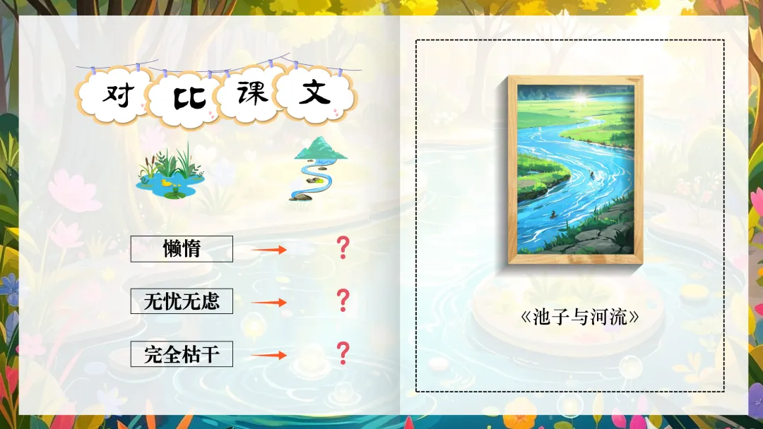 1.多层次“比读”,感受池子与河流生活的不同,学习“对比”的写法。