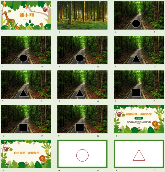 结合小班幼儿的年龄特点,本活动中以生动的情景导入,给孩子足够的自主操作材料与空间,通过层层递进的游戏环节,不断为幼儿创设铺小路的快乐氛围,孩子们在自主探索、自由操作的愉悦情境中,不仅获得了成功自信感,同时逐步加深对不同图形特征的认识。