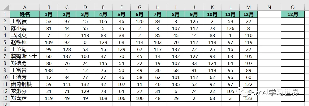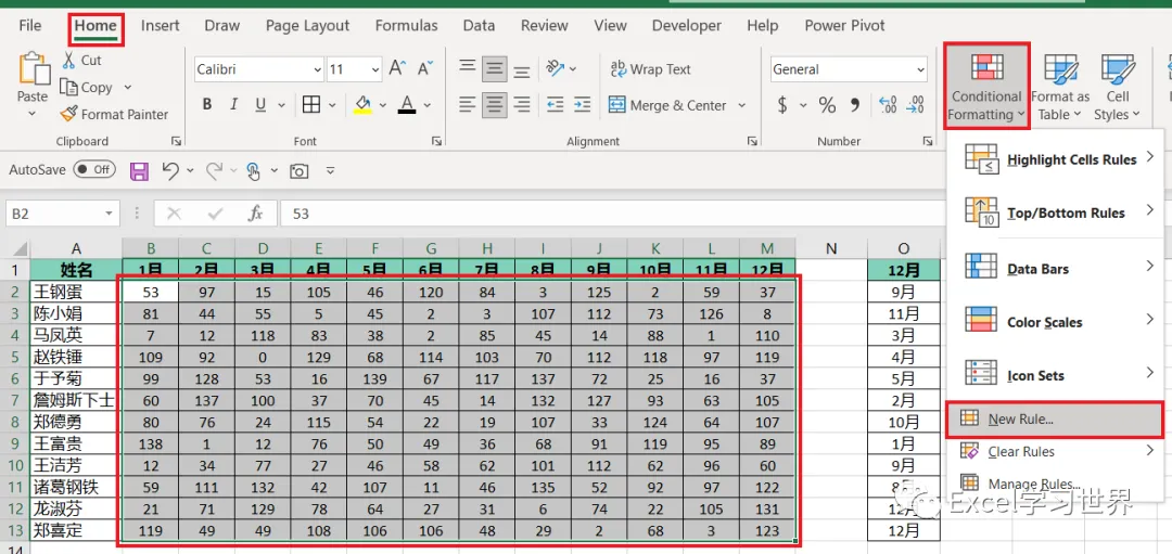 2. 选中 B2:M13 区域 --> 选择菜单栏的“开始”-->“条件格式”-->“新建规则”