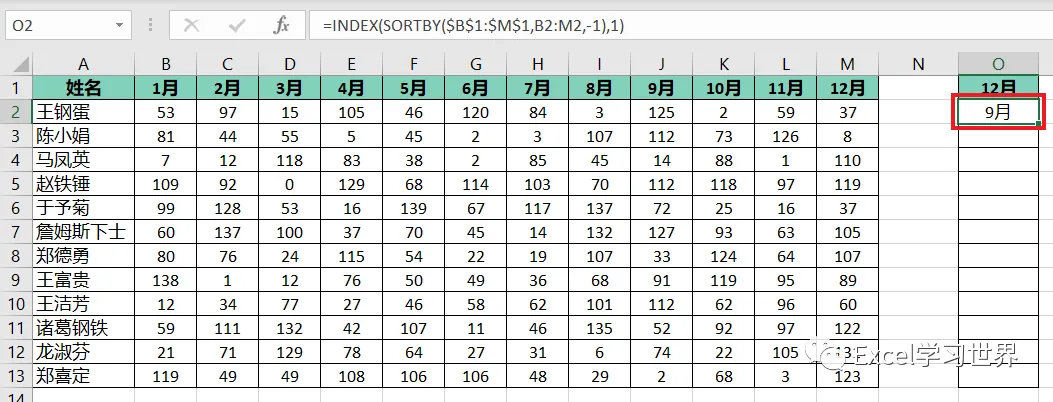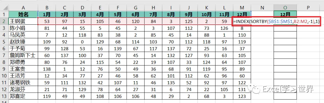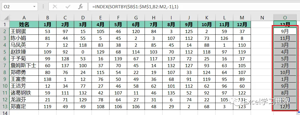 SORTBY($B$1:$M$1,B2:M2,-1):对 $B$1:$M$1 按以下条件排序