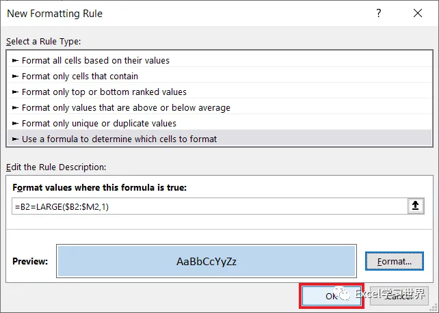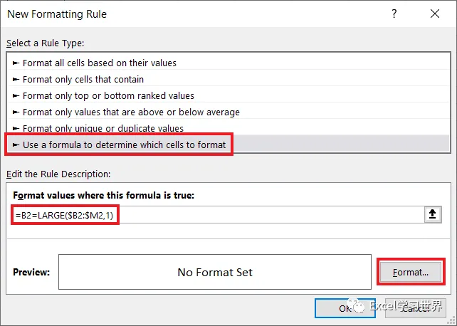 3. 在弹出的对话框中选择“使用公式确定要设置格式的单元格”--> 输入以下公式 --> 点击“格式”按钮: