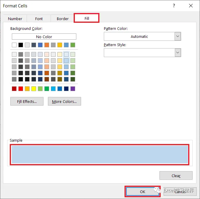 4. 在弹出的对话框中选择“填充”选项卡 --> 选择所需的填充色 --> 点击“确定”