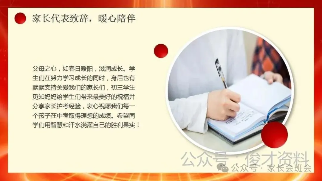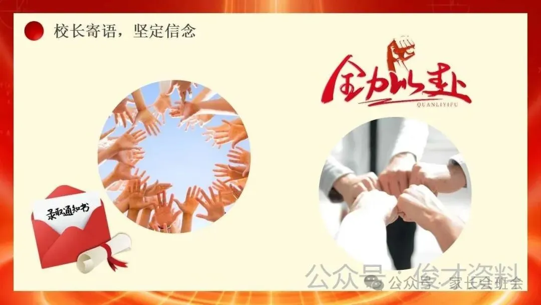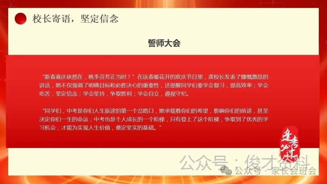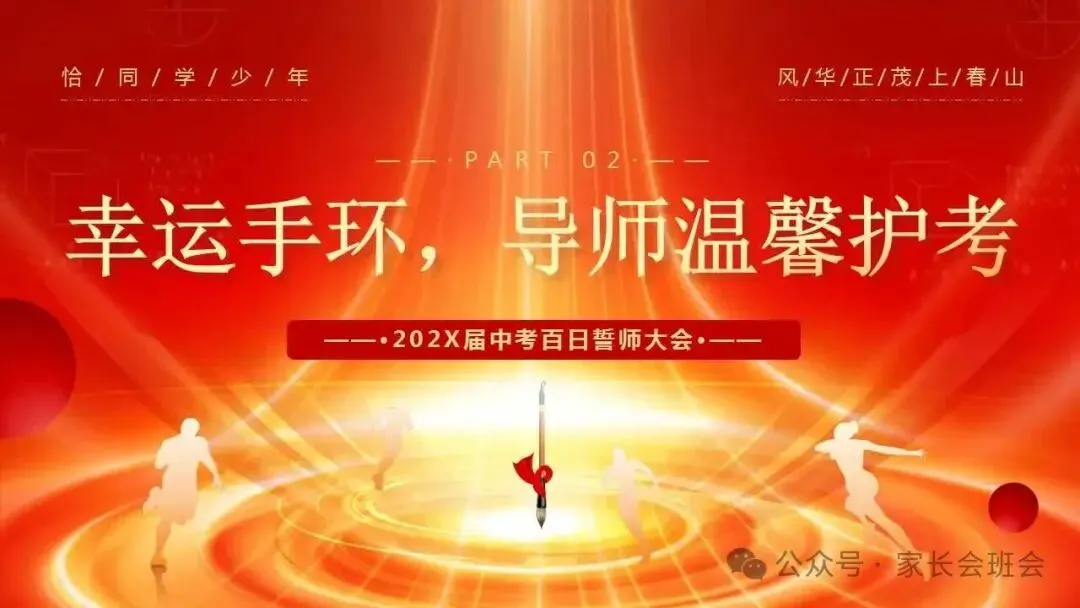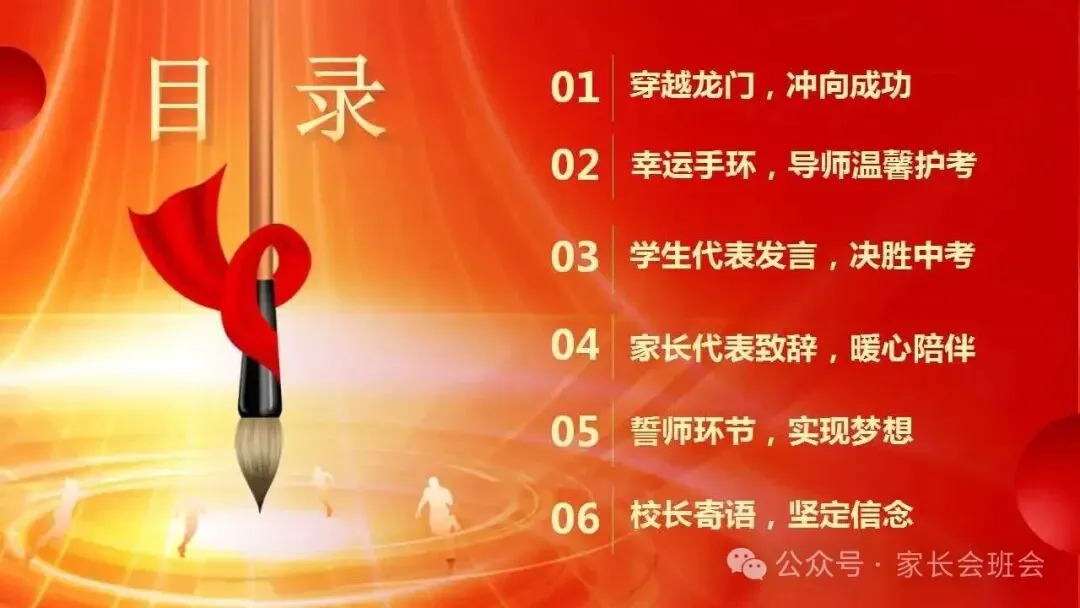 流程包括:1、穿越龙门,冲向成功;2、幸运手环,导师温馨护考;3、学生代表发言,决胜中考;4、家长代表致辞,暖心陪伴;5、誓师环节,实现梦想;6、校长寄语,坚定信念。