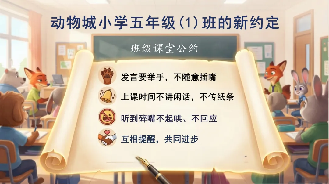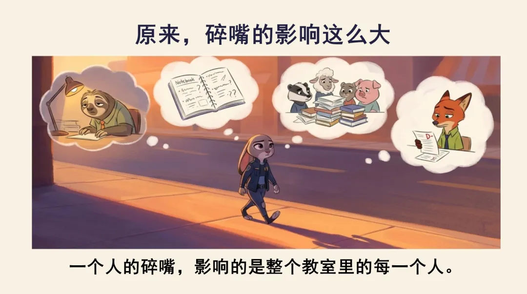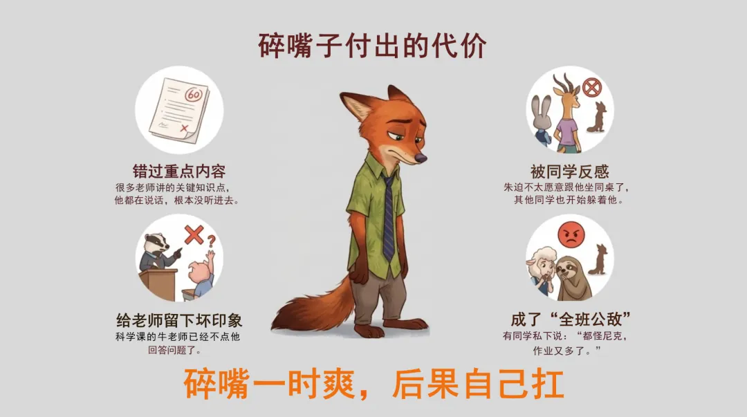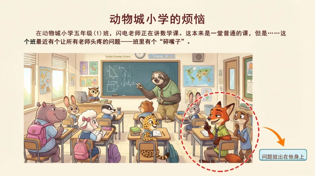 同学们好!今天我们要上一堂特别的班会课,故事发生在动物城小学五年级(1)班。这个班最近有个让所有老师头疼的问题——班里有个“碎嘴子”。他是谁呢?就是我们熟悉的狐狸尼克。今天,我们就跟着尼克的故事,一起来聊聊课堂上的“碎嘴子”问题。说的是你吗?让我们一起来看看。