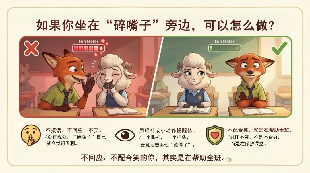 引导全班学生形成共识:不回应、不配合笑的同学不是“不合群”,而是在帮助全班维护课堂秩序,切断“碎嘴子”的观众,让其自觉无趣。