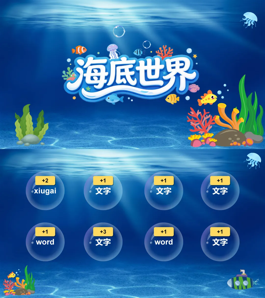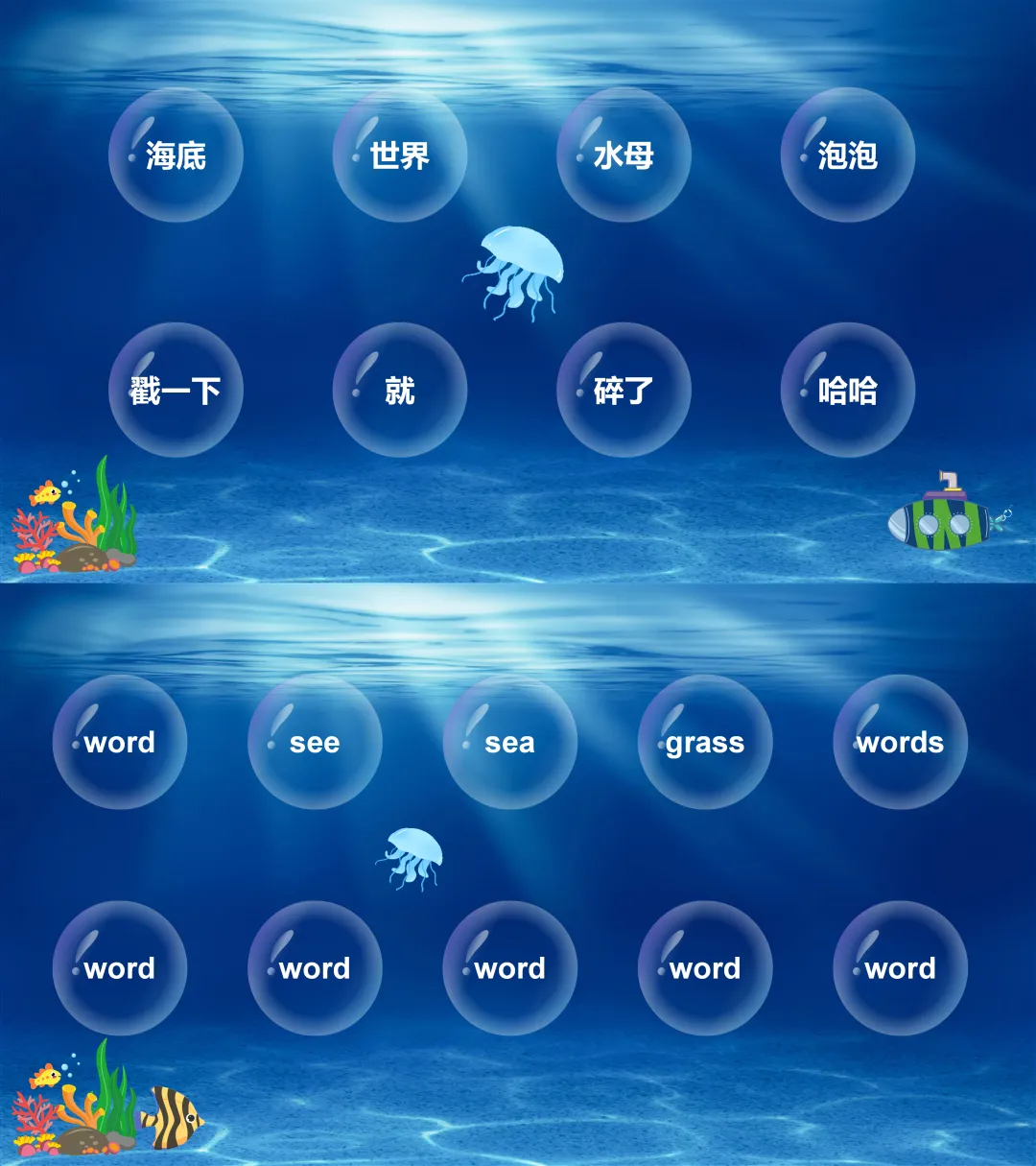 今天给大家分享超有趣的海底世界识字游戏,一共有三个版本,无论是幼儿园的萌娃,还是中小学的学生,都能在欢乐中认识生字、生词和单词,而且所有文本文案都能轻松修改,文件里还有详细使用说明的视频,上手超容易~一起看下效果吧: