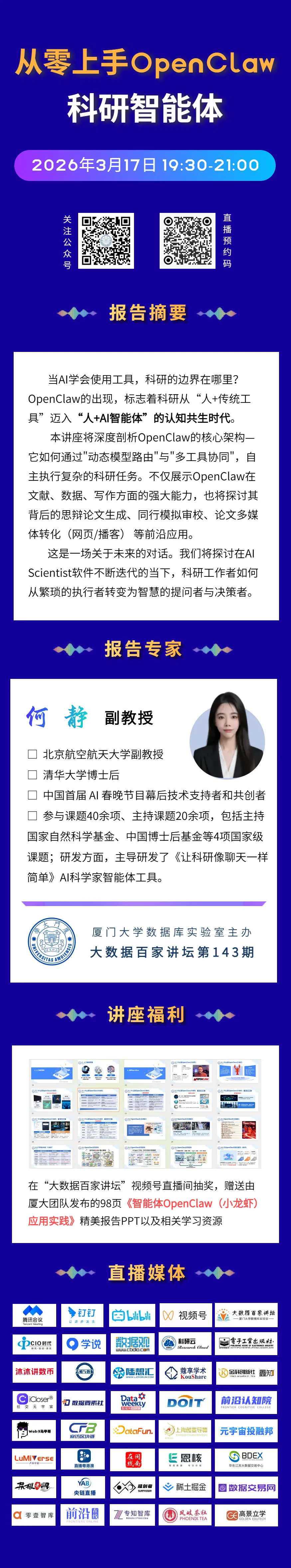 大数据百家讲坛由厦门大学数据库实验室在2020年3月份发起,是厦门大学数据库实验室“高校大数据公共服务平台”的重点子工程。大数据百家讲坛目标规划是举办100场讲座,分别请不同大数据专家分享,包括但于政府领导、企业管理层或技术层以及高校教师。分享内容和主题涵盖大数据、人工智能、物联网、云计算、智慧城市和区块链等前沿最新技术及其产业化应用。