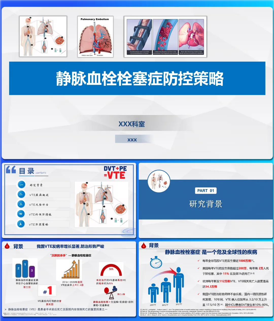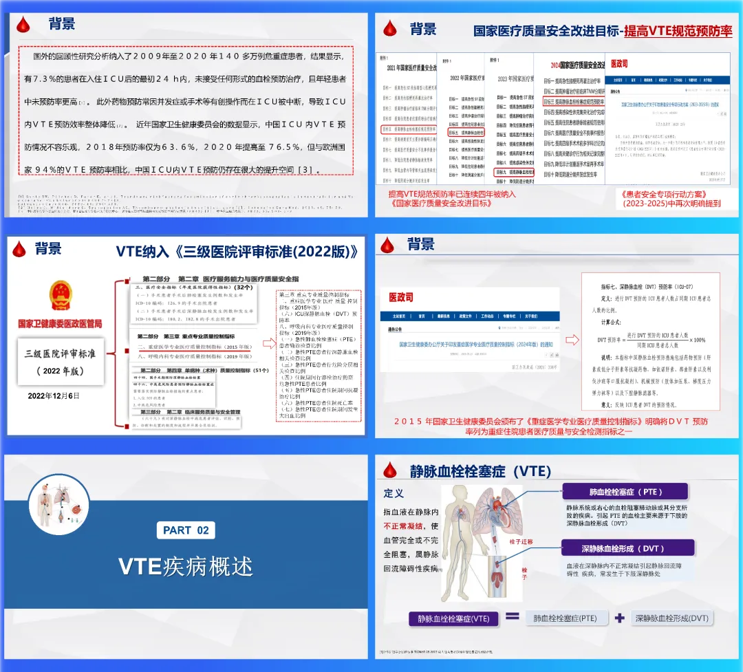 第一部分,研究背景:通过国内外数据揭示VTE的高发病率、死亡率及作为院内可预防死因的严重性,明确指出提高VTE规范预防率已连续多年被纳入国家医疗质量安全改进目标与患者安全行动方案,是ICU及全院性的质控重点。