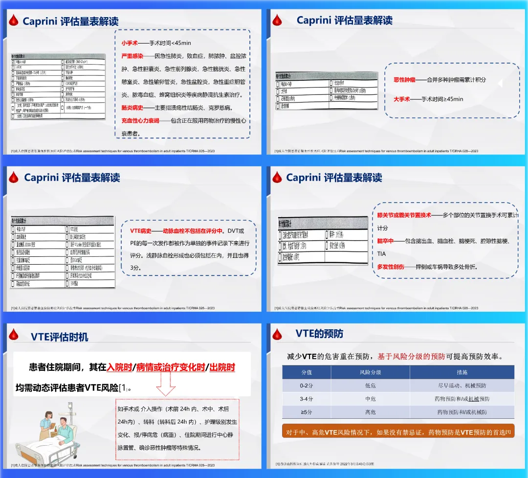第三部分,VTE风险评估:强调准确风险评估是采取预防措施的关键环节。介绍了Caprini(外科患者)、Padua(内科患者)等风险评估量表,并详细解读了Caprini量表的各项评分细则。明确了入院时、病情变化时、出院时的动态评估时机,以及基于风险分级(低、中、高危)的预防策略。