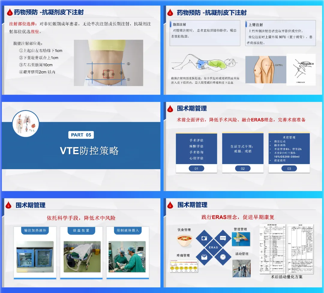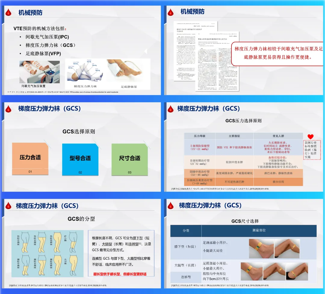 第四部分,VTE的预防措施:系统阐述三级预防。基础预防包括早期活动、踝泵运动、避免脱水。机械预防重点介绍了梯度压力弹力袜(GCS)的压力等级选择、分型(膝下型、大腿型)和尺寸测量方法。药物预防概述了常用抗凝药物,并详细规范了皮下注射的适应证、禁忌证及腹部注射的定位区域与方法。
