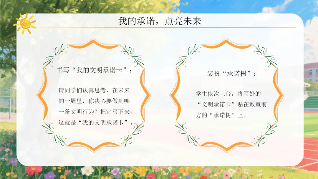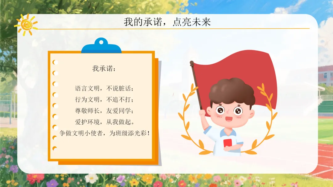 师:也许,你承诺的是“主动向老师问好”;也许,你承诺的是“再也不说一句脏话”;也许,你承诺的是“吃饭时绝不浪费一粒粮食”;也许,你承诺的完整版可编辑电子资料 获取方式: