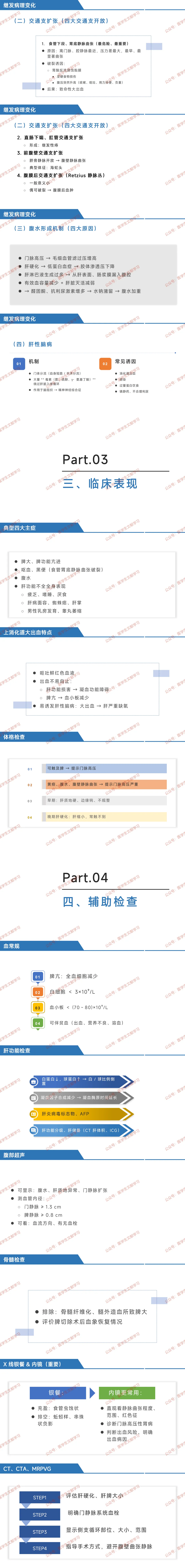 交通支扩张:食管胃底静脉曲张最危险,易因胃酸、坚硬食物、腹压骤升破裂引发致命大出血;其余交通支扩张可形成痔、腹壁静脉曲张(海蛇头)、腹膜后血肿。