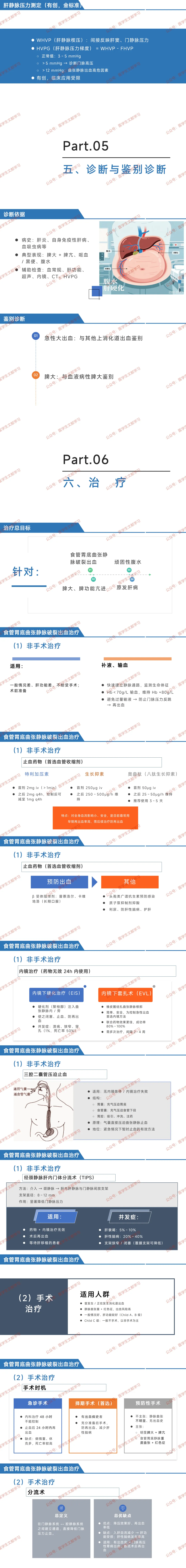 非手术治疗:适用于一般情况差、肝功能差或术前准备,包括补液输血(维持 Hb≈80g/L);首选血管收缩剂(特利加压素、生长抑素等),β 受体阻滞剂用于预防出血,辅以抗生素、抑酸药;药物无效 24h 内行内镜治疗,EVL 为急性出血首选,EIS 为备选;无内镜条件时用三腔二囊管暂时止血;药物 + 内镜无效者行 TIPS,适用于等待肝移植患者,并发症有肝衰竭、肝性脑病。