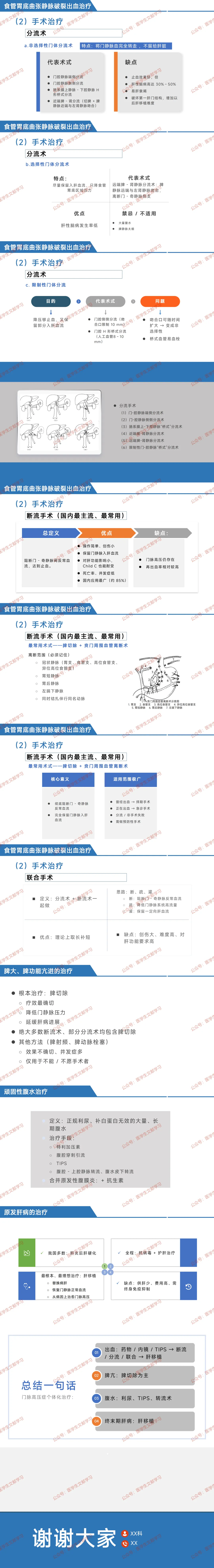 手术方式:分流术(建立门 - 腔静脉通道,分非选择性、选择性、限制性,降压效果好但肝性脑病发生率高);断流手术(国内主流,阻断门 - 奇静脉反常血流,首选脾切除 + 贲门周围血管离断术,操作简单、对肝功能影响小,再出血率相对高);联合手术(分流 + 断流,理论取长补短,创伤大、对肝功能要求高)。
