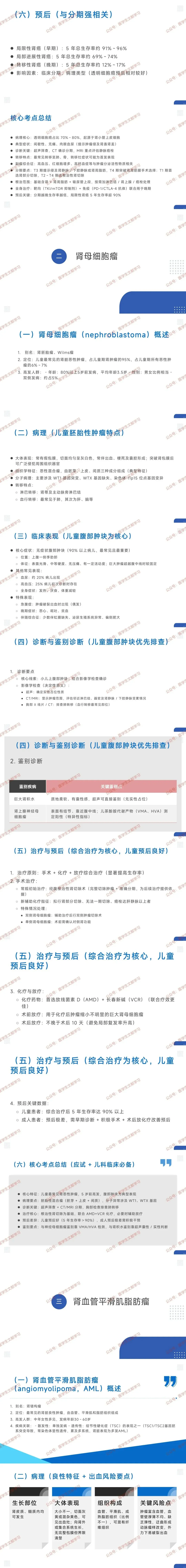 - 病理:恶性混合瘤,含胚芽、上皮、间质三种成分,分子异常涉及 WT1、WTX 基因,转移以肺、肝、脑为主。