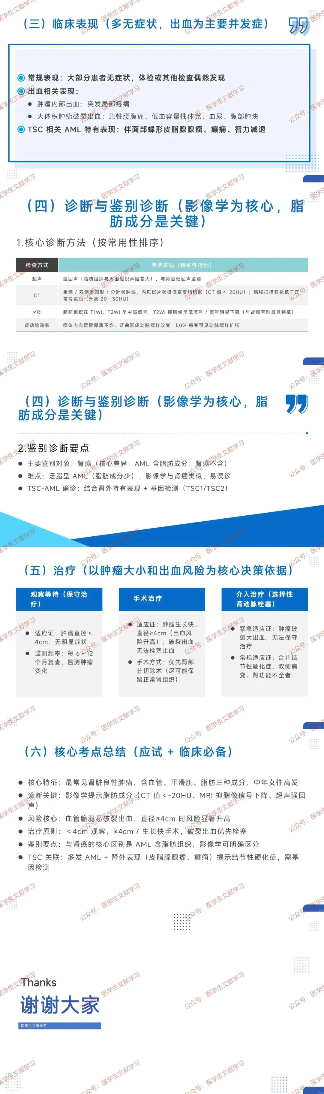 成人肾肿瘤以肾细胞癌为主,早期筛查依赖超声,治疗以手术为核心,晚期需靶向 + 免疫联合;儿童肾母细胞瘤以腹部肿块为典型,综合治疗预后优异;肾血管平滑肌脂肪瘤为良性,重点防控出血风险。鉴别诊断的关键是肾癌无脂肪成分,而 AML 含特征性脂肪组织。