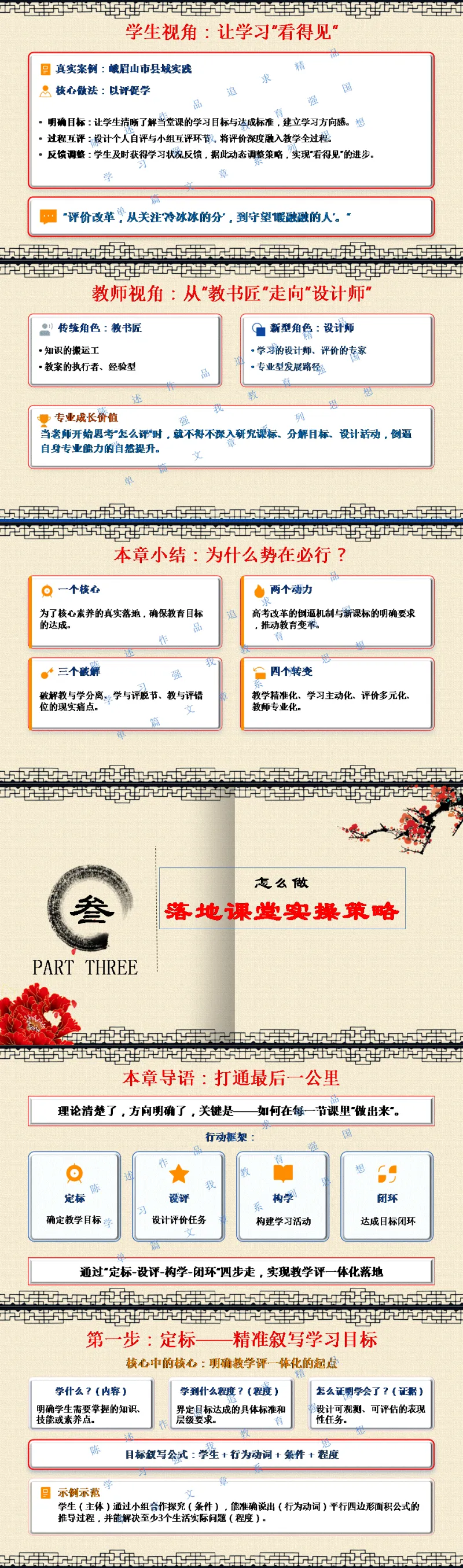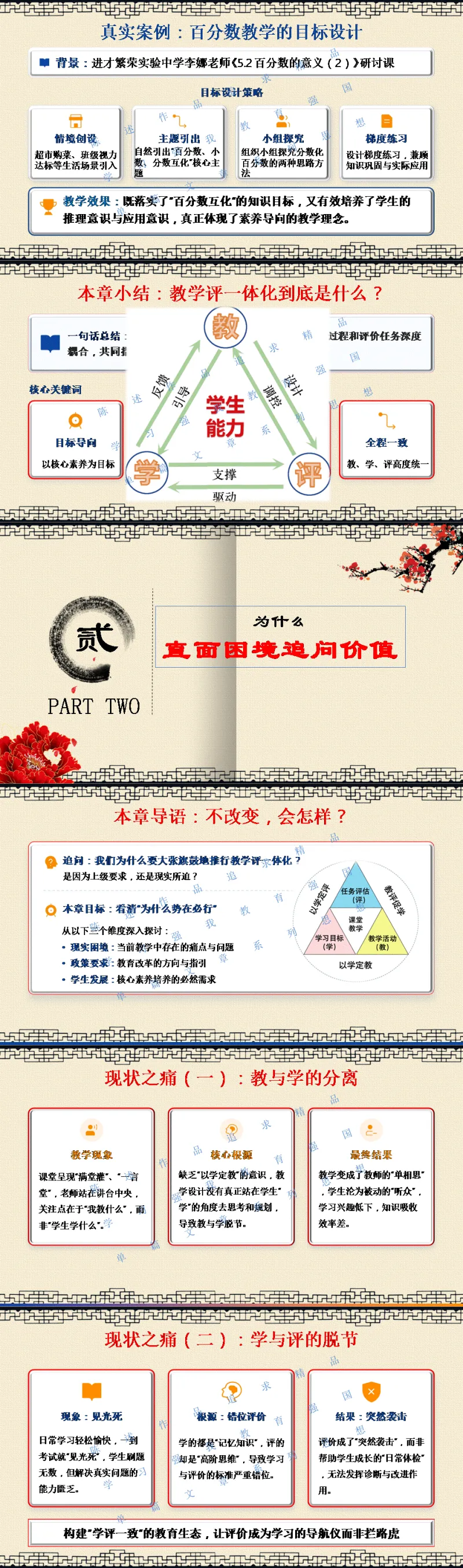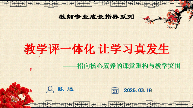 选择关注,关注陈述教学公众号,能力会提高。文末阅读一线校长更多原创内容。阅读提示:你是否也有这样的困惑——教了,学生却没学会;学了,考试却不会做;考了,素养却没落地?《教学评一体化,让学习真发生》——一场直击课堂痛点的深度剖析,一次从理念到行动的完整导航。不讲空洞理论,只给实操路径;不玩概念游戏,只求真实改变。从“定标—设评—构学—闭环”四步法,到全国多地真实落地案例,带你走出“教与学分离、学与评脱节”的困局,让每一节课都指向目标,让每一次学习都真实发生。教学评一体化不是一场“运动”,而是一场回归教育本真的静悄悄的革命。让教师教得明白,让学生学得真实,让质量看得见——这是《教学评一体化,让学习真发生》培训课件的使命。若需原汁原味的具有动画音响功能的原版电子版PPT课件,请阅读到课件文末说明。线上线下讲座预定请联系陈述校长19946913958(微信同号)。