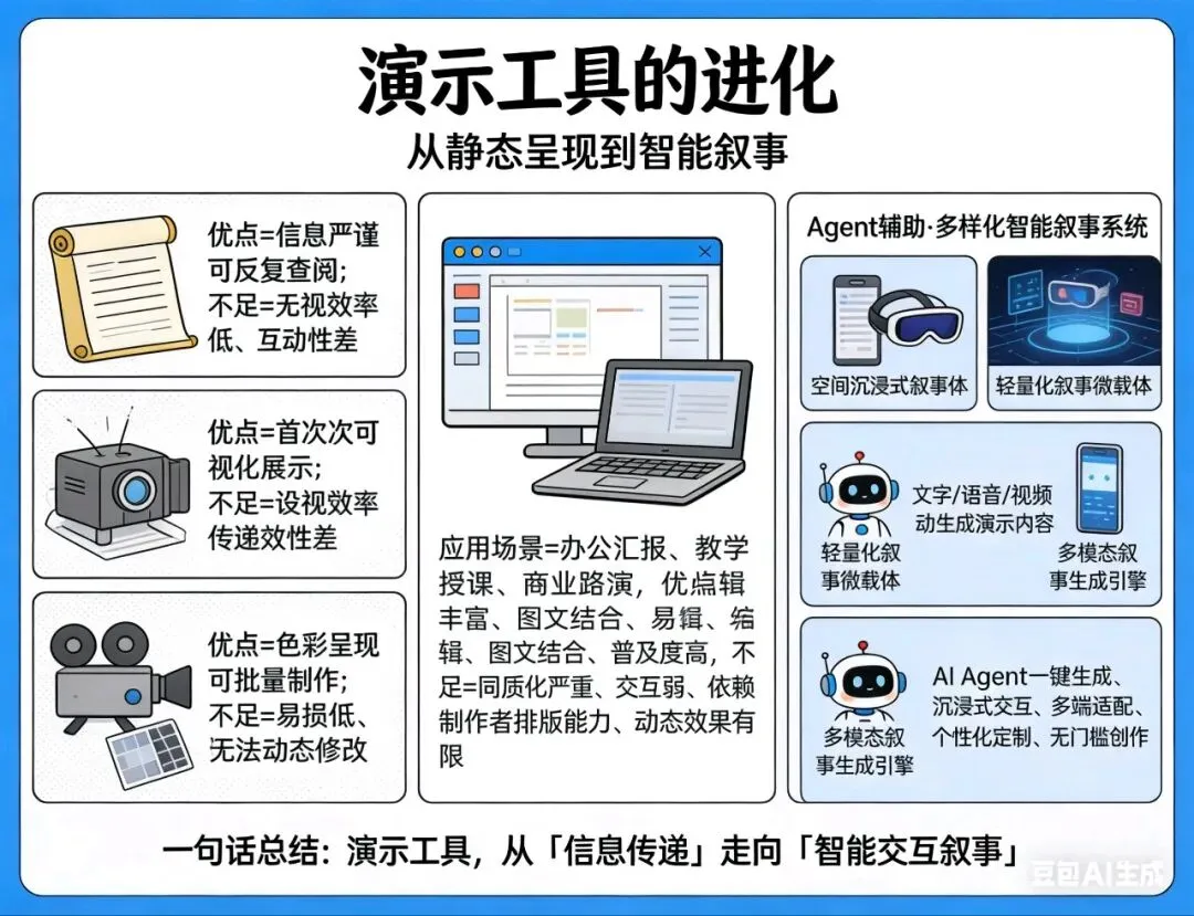 未来的PPT,可能不会再叫“PPT”,也不会再是一页一页的静态文档,它会进化成各种全新的智能叙事系统。但它的根,永远是今天我们所理解的PPT——那个适配人类决策逻辑、为说服而生的叙事载体。