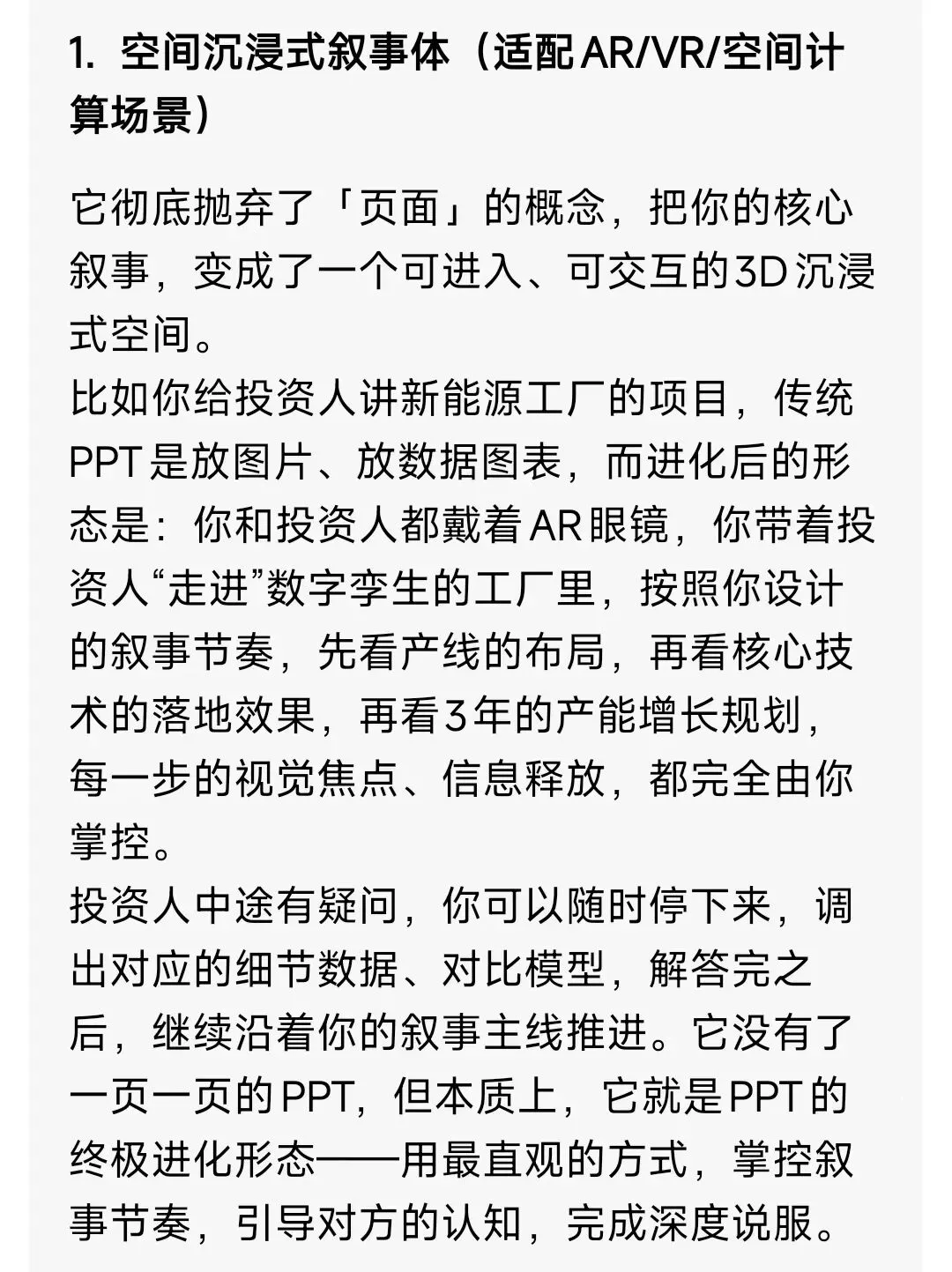随着空间计算、AR/VR、数字孪生技术、Agent的普及,PPT会逐渐跳出2D屏幕、一页一页翻页的形式限制,分化出不同场景下的全新形态,但永远不脱离可控叙事、引导决策的核心,本质是对注意力的精准引导、专业与信任的具象化背书,以及合规留痕可追溯。