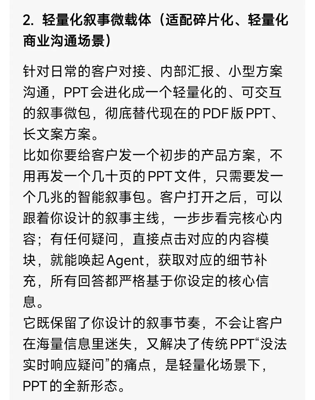 未来的信息传递会彻底适配Agent环境,PPT只是适配人类信息接收方式的过渡产物。