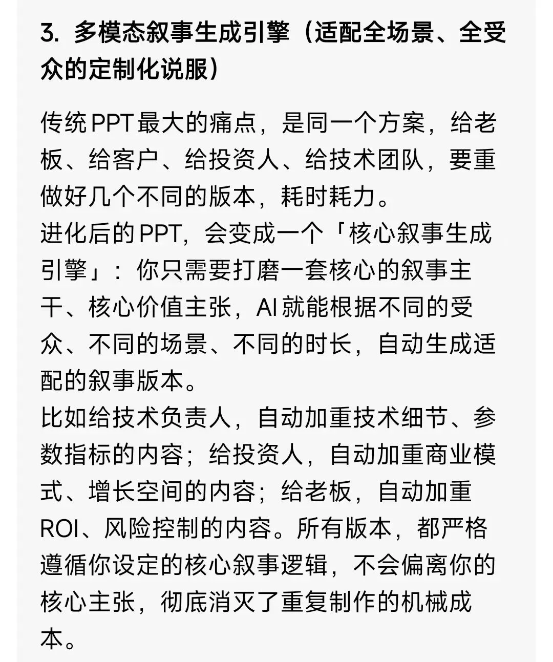 AI的出现,可以把PPT从“排版工具”,彻底升级成“叙事说服的超级载体”。它消灭的是PPT制作的机械成本,而不是PPT作为商业说服核心载体的价值。