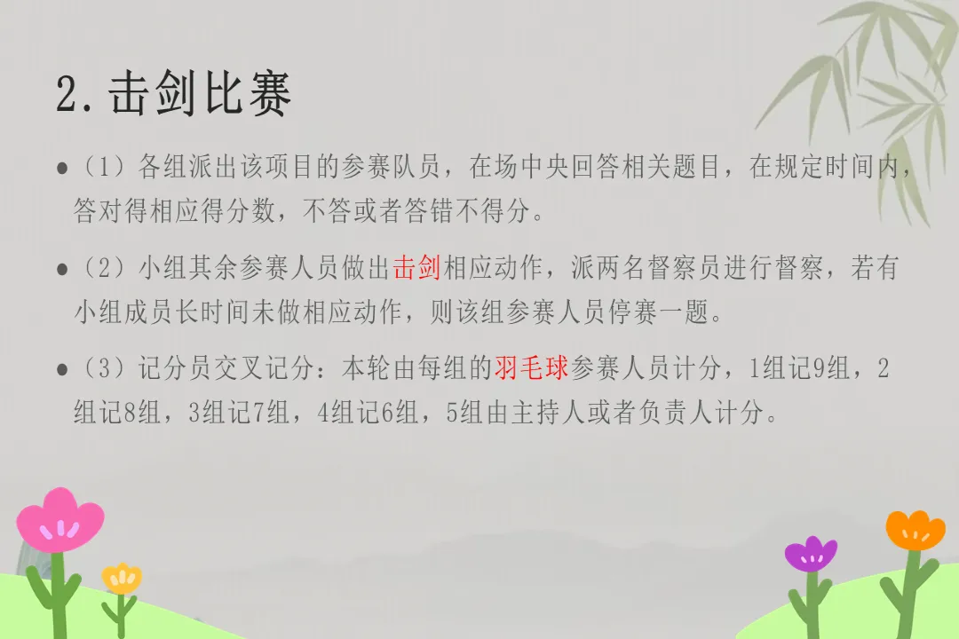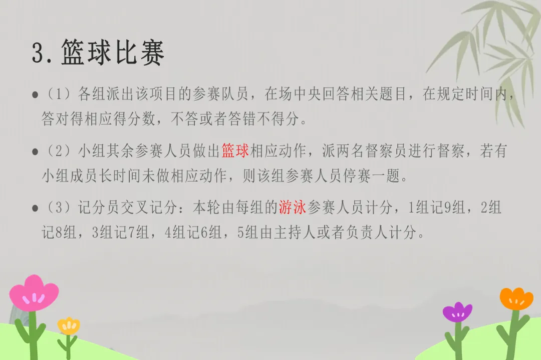 首先说一下,这次运动会一共设了游泳、击剑、篮球、乒乓球、拔河、划船、体操、羽毛球 8 个项目,每个项目的规则都差不多,大家记好。每个项目各组都要派队员出来答题,在规定时间里答对给分,不答或者答错就没分。剩下的同学要做对应项目的动作,有两名督察员看着,要是有人长时间不做动作,那答题的队员就停赛一题,大家都配合好。