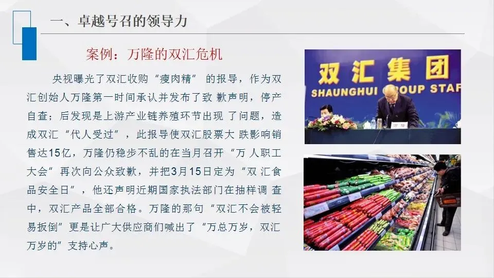 央视曝光了双汇收购“瘦肉精” 的报导,作为双汇创始人万隆第一时间承认并发布了致 歉声明,停产自查;后发现是上游产业链养殖环节出现 了问题,造成双汇“代人受过”,此报导使双汇股票大 跌影响销售达15亿,万隆仍稳步不乱的在当月召开“万 人职工大会”再次向公众致歉,并把3月15日定为“双 汇食品安全日”,他还声明近期国家执法部门在抽样调 查中,双汇产品全部合格。万隆的那句“双汇不会被轻 易扳倒”更是让广大供应商们喊出了“万总万岁,双汇 万岁的”支持心声。