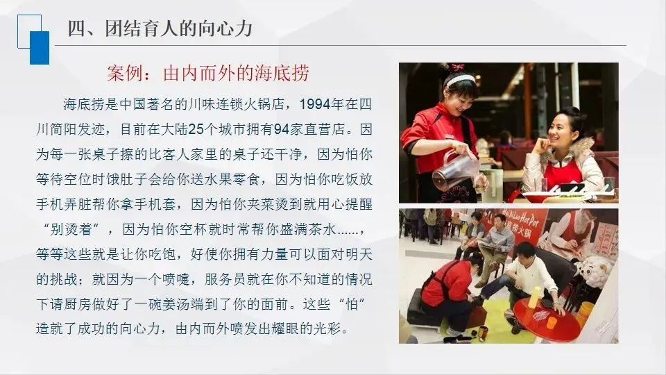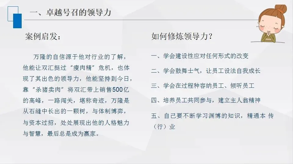 是“能够激发和唤醒身边人认 同-跟随,就要博之以信,博之以心”; 有强大的危机处理能力。