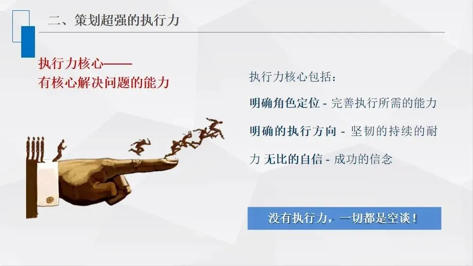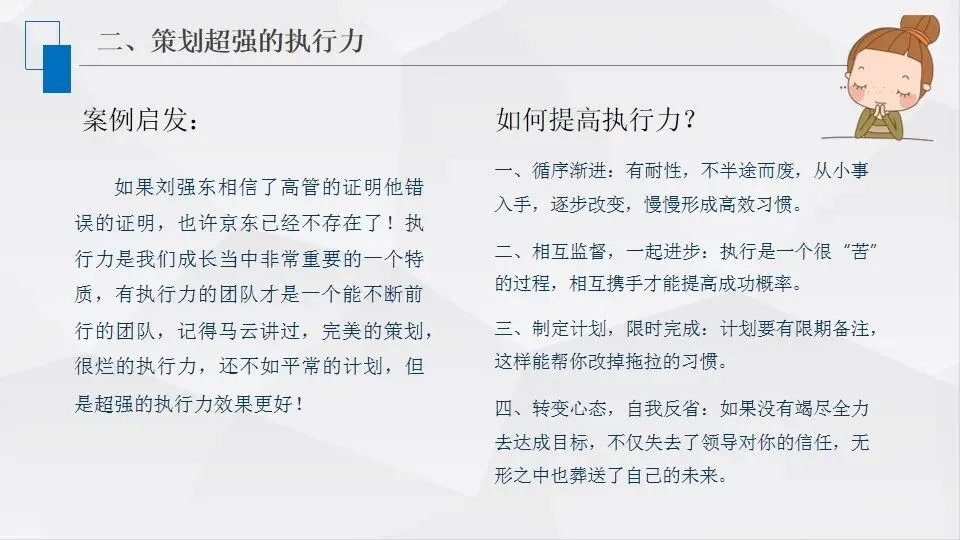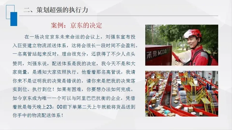 如果刘强东相信了高管的证明他错 误的证明,也许京东已经不存在了!执 行力是我们成长当中非常重要的一个特 质,有执行力的团队才是一个能不断前行的团队,记得马云讲过,完美的策划, 很烂的执行力,还不如平常的计划,但是超强的执行力效果更好!