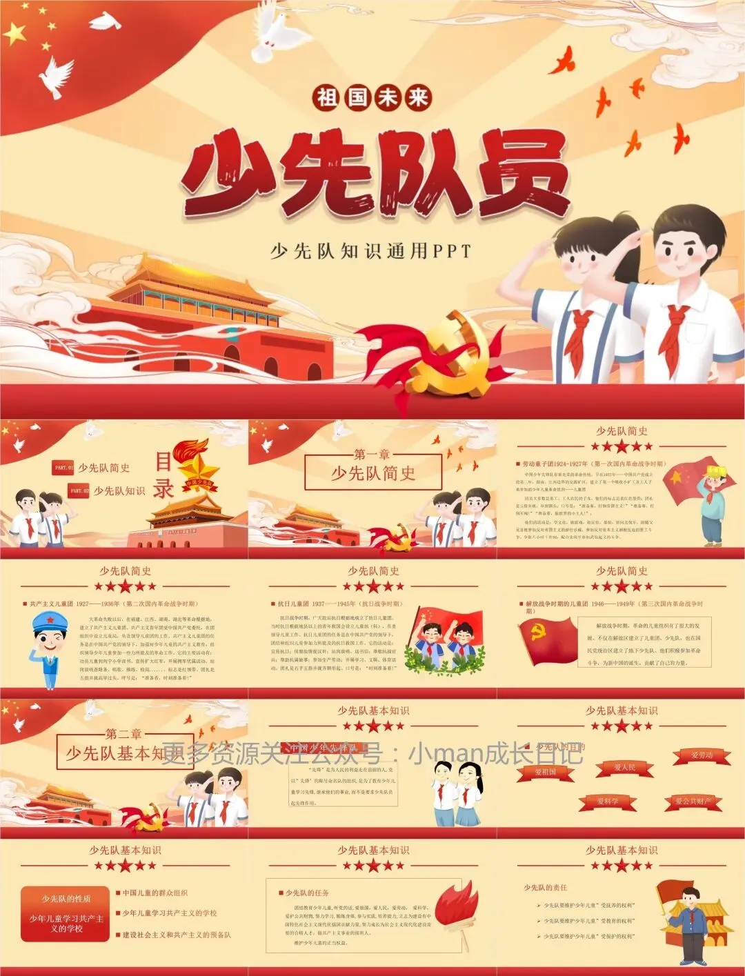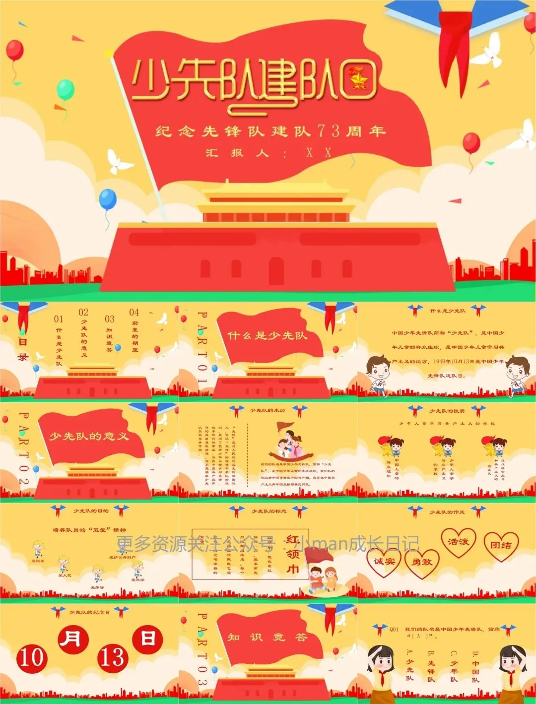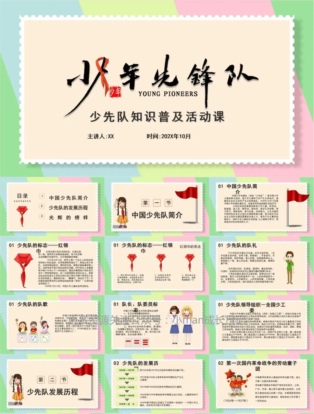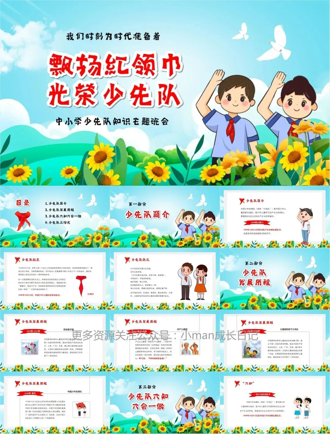 从队课学习到主题活动,从红色宣讲到成长仪式,这套【少先队专属PPT智库】用53种童趣设计,将政治启蒙的种子化作生动画面——您的每一次点击,都在为孩子们系好人生第一粒扣子。