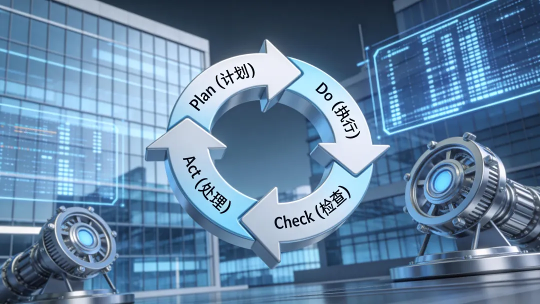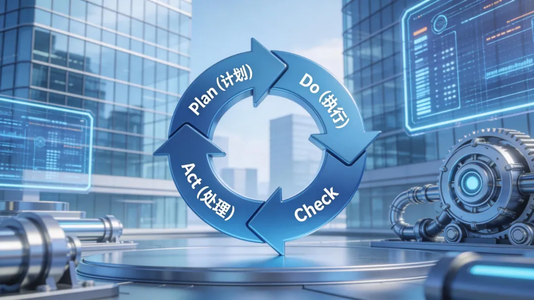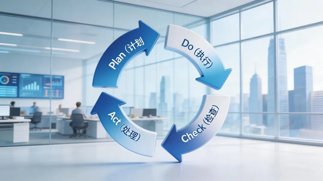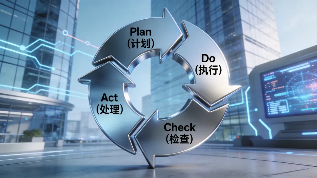 一个循环箭头,分成4个小箭头,顺时针排布,箭头上面分别写着“Plan(计划)”、“Do(执行)”、“Act(处理)”、“Check(检查)”,3D效果,背景是一个高科技企业。