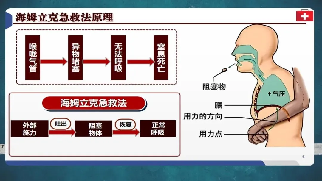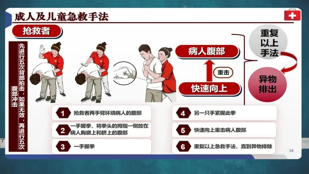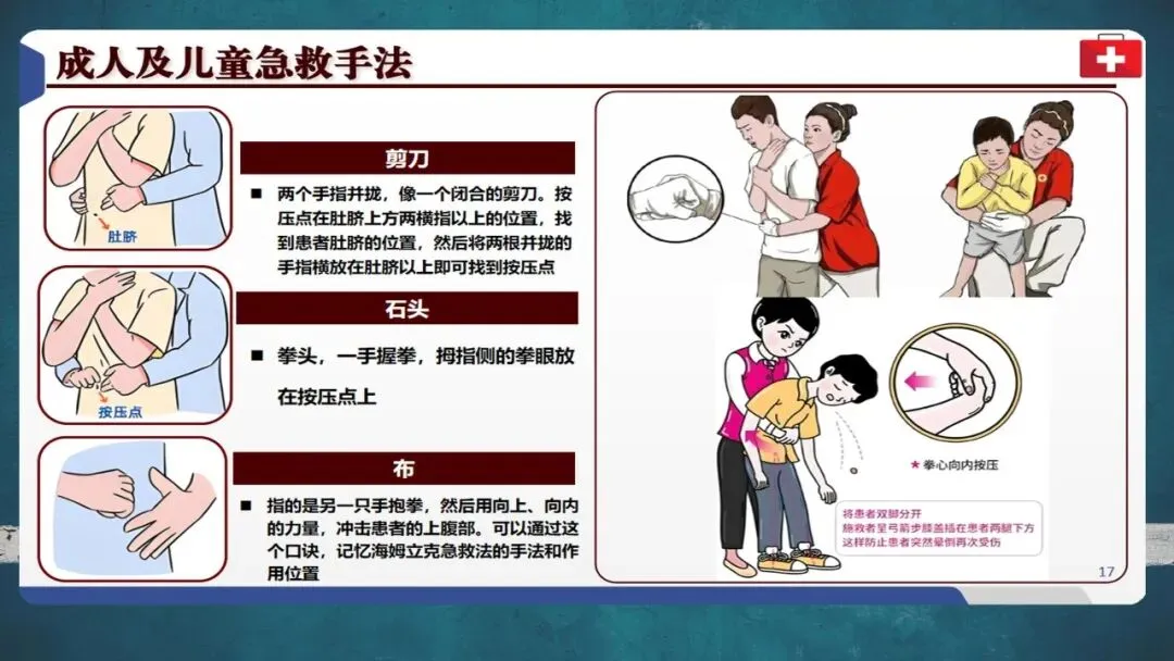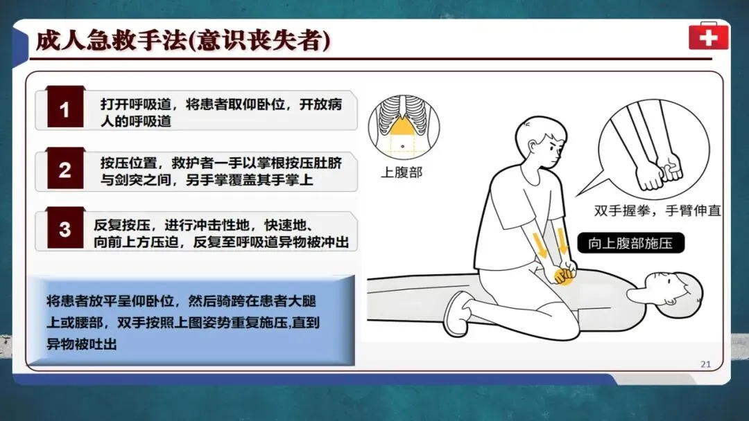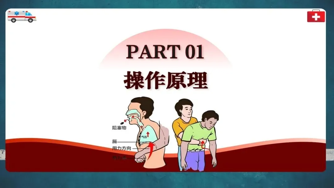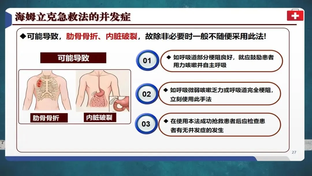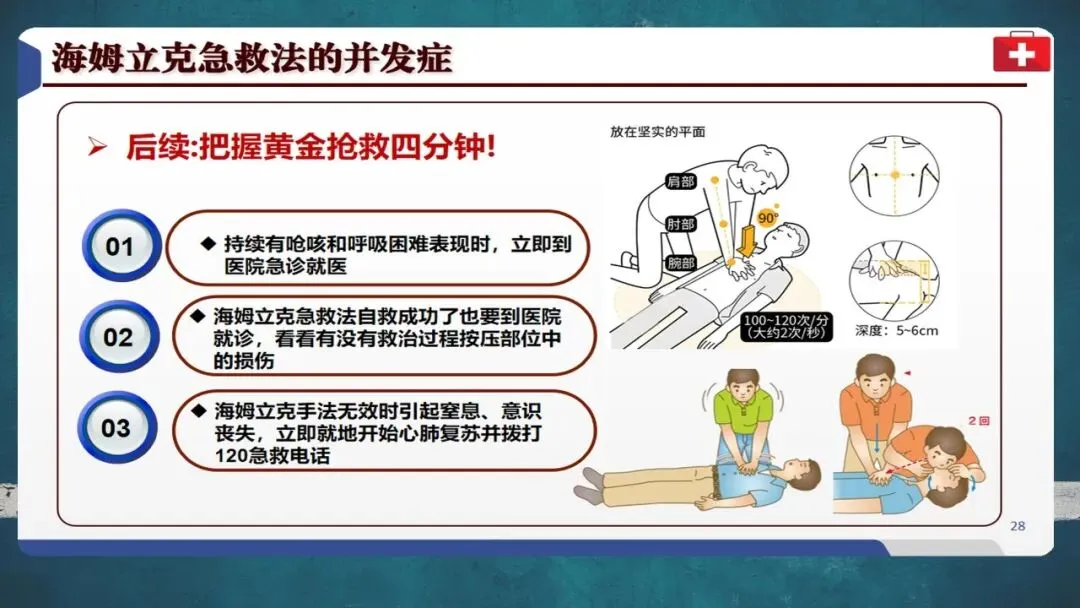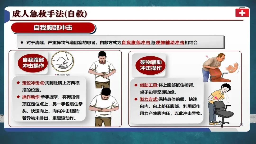 自救时可用椅背等硬物辅助冲击腹部。成功施救后仍需就医检查有无肋骨骨折或内脏损伤等并发症。