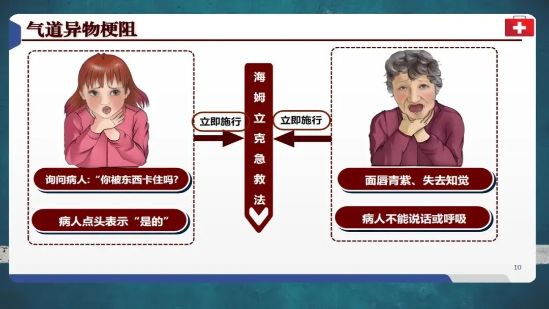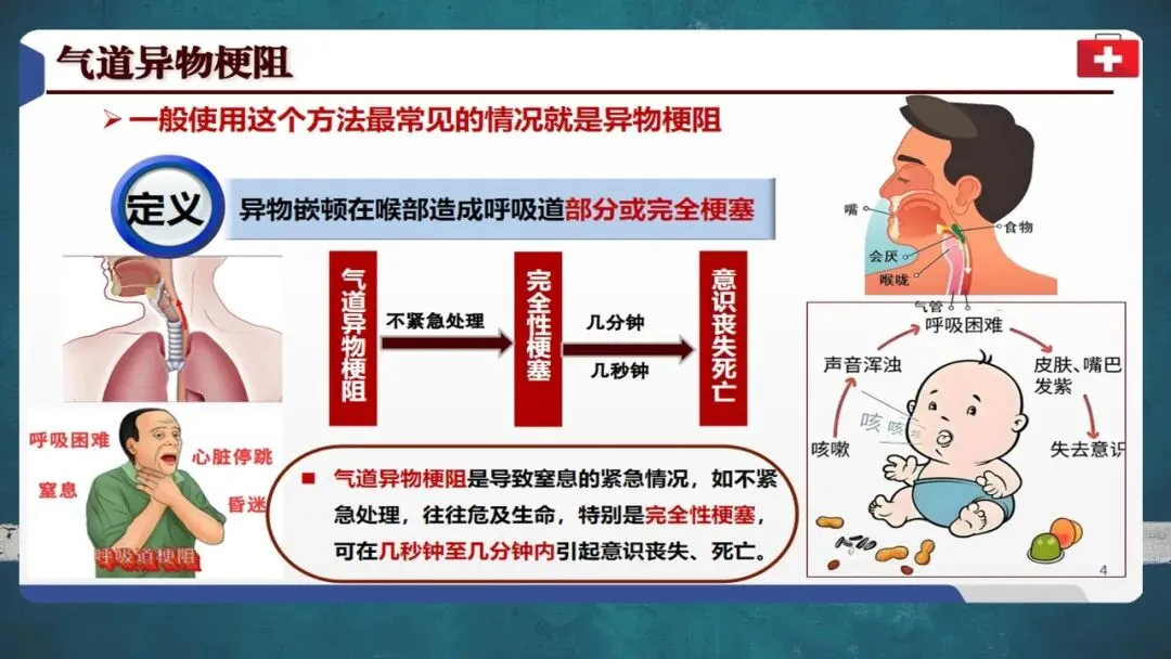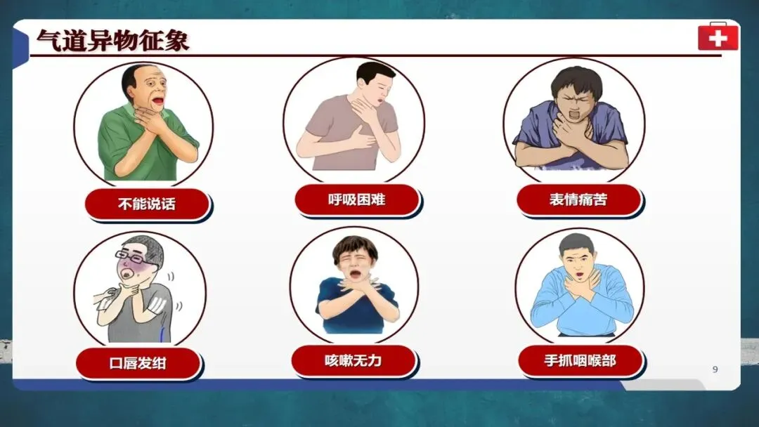 当有人突然无法说话、呼吸困难、手抓咽喉、表情痛苦时,很可能是发生了气道异物梗阻。完全性梗阻可在几分钟内导致窒息死亡,必须立即施救。