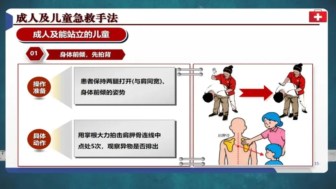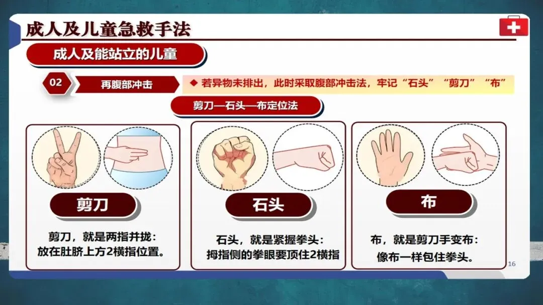 根据2025年美国心脏协会最新指南,急救步骤已更新:对清醒的成人及儿童,应先进行5次背部拍击,若无效再实施5次腹部冲击,交替循环直至异物排出。背部拍击更安全,腹部冲击则利用气流冲出异物。操作时牢记“剪刀、石头、布”定位法:两指定位肚脐上两横指,握拳冲击,另一手包裹发力。
