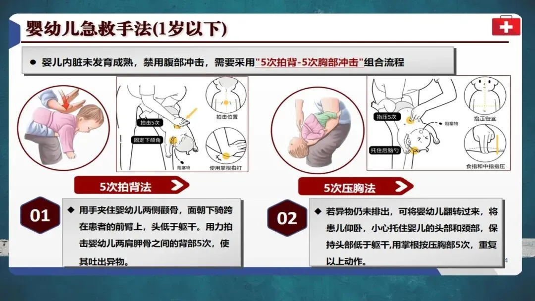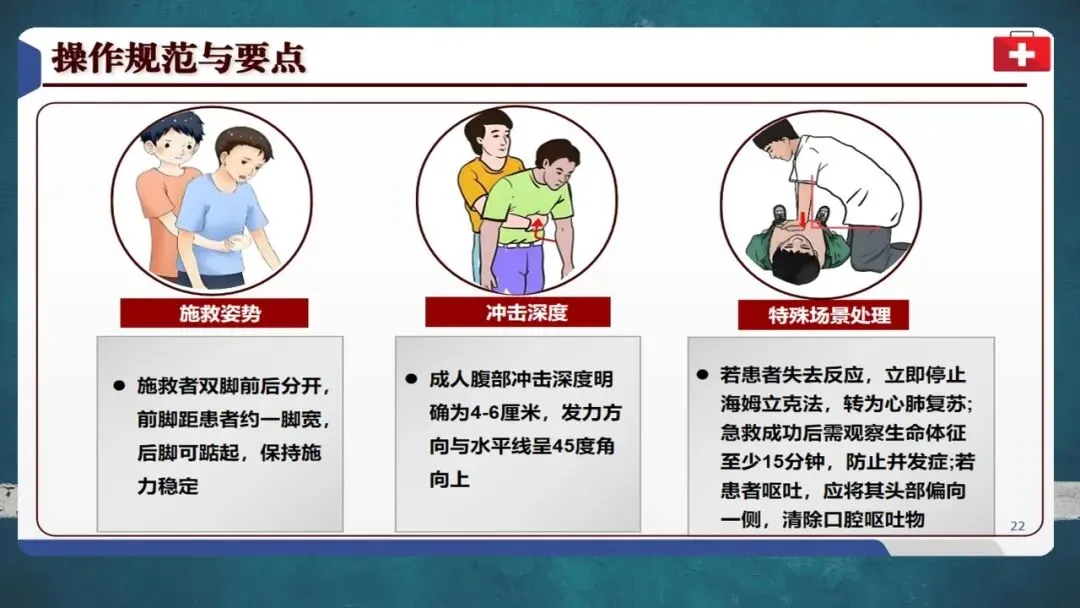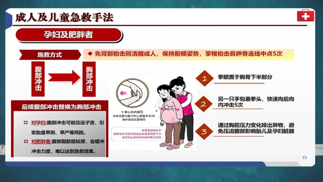 特别提醒:孕妇和肥胖者应采用胸部冲击替代腹部冲击;1岁以下婴儿禁用腹部冲击,须采用5次拍背加5次压胸法;若患者意识丧失,应立即转为心肺复苏并拨打120。