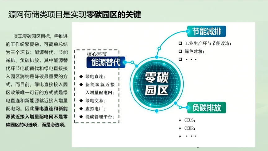 这份文档围绕源网荷储同类项目展开,解析了其与零碳园区等项目的关联、投资路径及核心价值,明确源网荷储类项目是实现零碳园区的关键支撑。源网荷储同类项目涵盖源网荷储一体化、智能微电等,关联零碳园区、绿电园区、绿电直连、增量配电等业务形态,且相关项目建设有明确政策支撑,如山西省出台绿电园区建设指引,提出增量配网与绿电园区政策叠加,国家层面也发布零碳园区建设、绿电直连发展等相关文件,为项目推进划定方向。