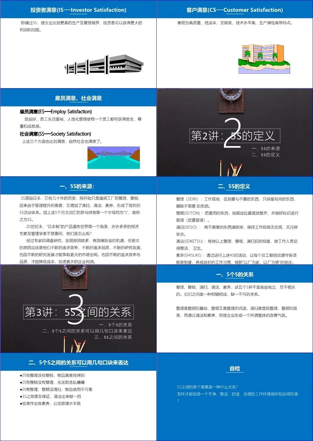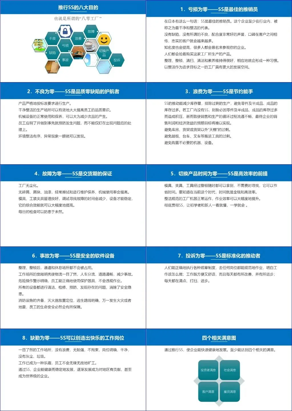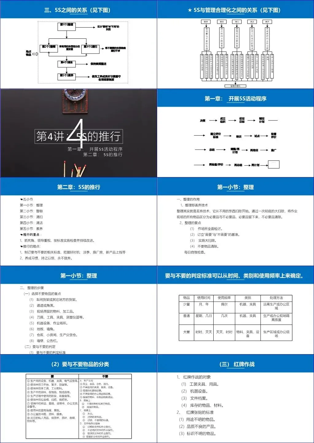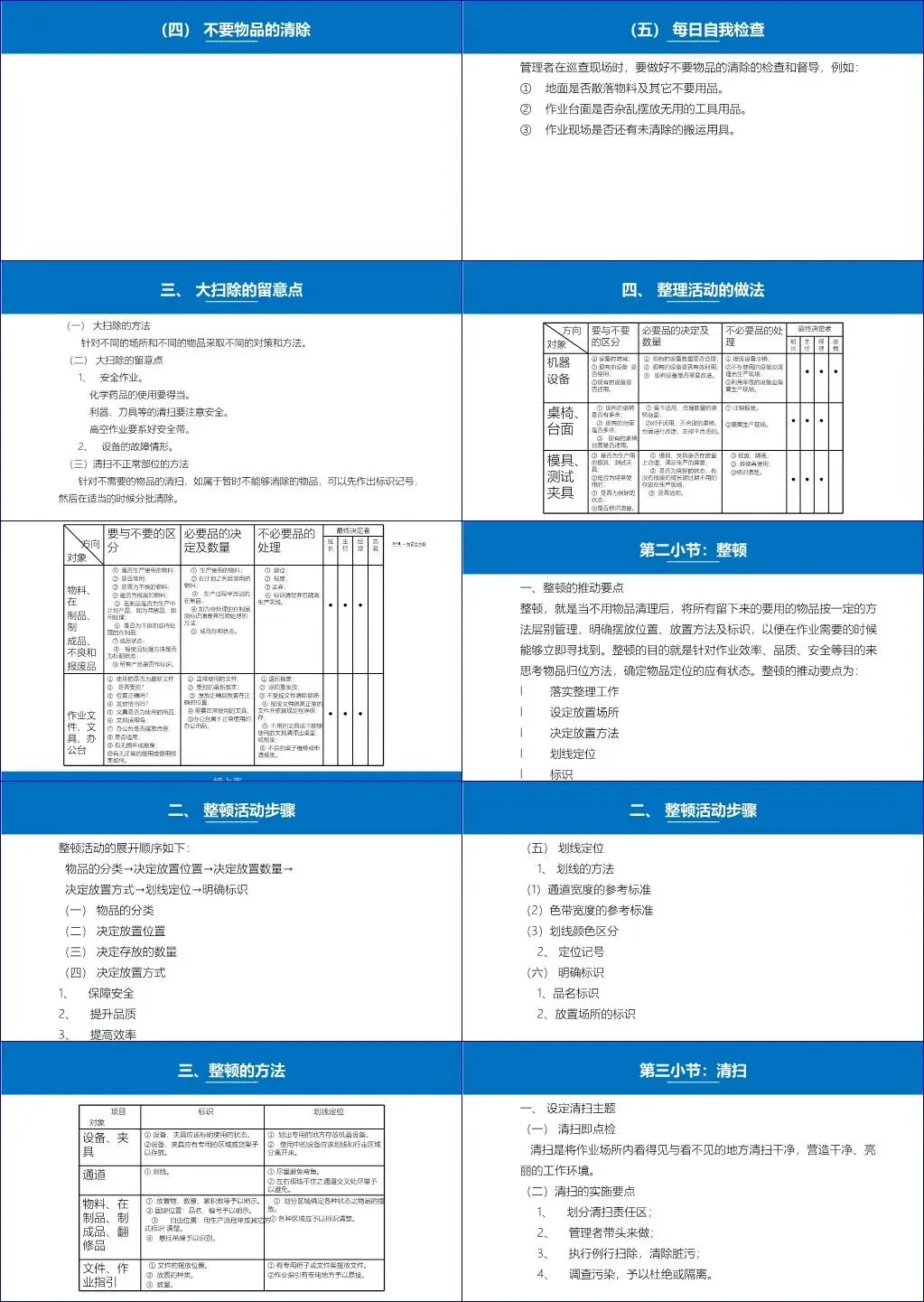 在推行方法上,文档提供了一套完整的程序,从成立组织、设定目标到试点、检查、评价和推广,并针对每个“S”给出了具体的实施步骤、要点和难点。例如,通过“红牌作战”来识别和清除不要物,通过划线定位和明确标识来实现整顿,以及通过持续的教育训练来提升员工素养。最终,5S的目标不仅是美化现场,更是要创造一个能让投资者、客户、雇员和社会都满意的卓越企业。