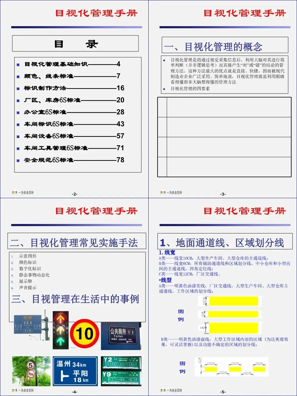 整份手册以“标准化、可视化、可执行”为核心,通过大量图例和尺寸参数,确保6S目视化措施在工厂车间、仓库管理、办公环境等场景中落地见效,最终达成提升现场管理水平、保障安全生产、塑造企业形象的目标。