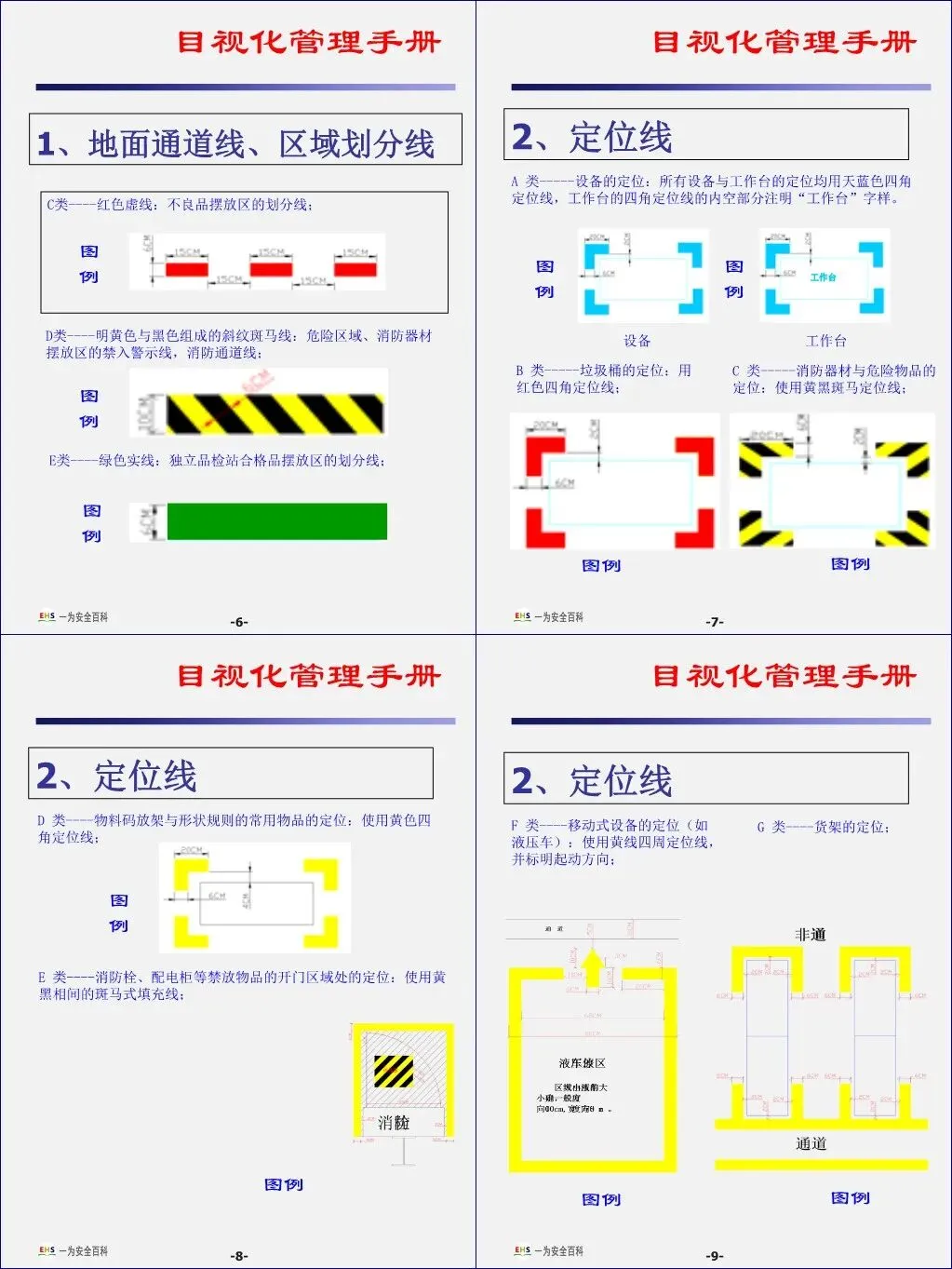 颜色与线条标准:规范了地面通道线(如主通道10cm明黄实线、不良品区红虚线、危险区黄黑斑马线)、设备/物品定位线(如天蓝色定设备、红色定垃圾桶、黄黑斑马线定消防器材)等的线宽、颜色及用途。
