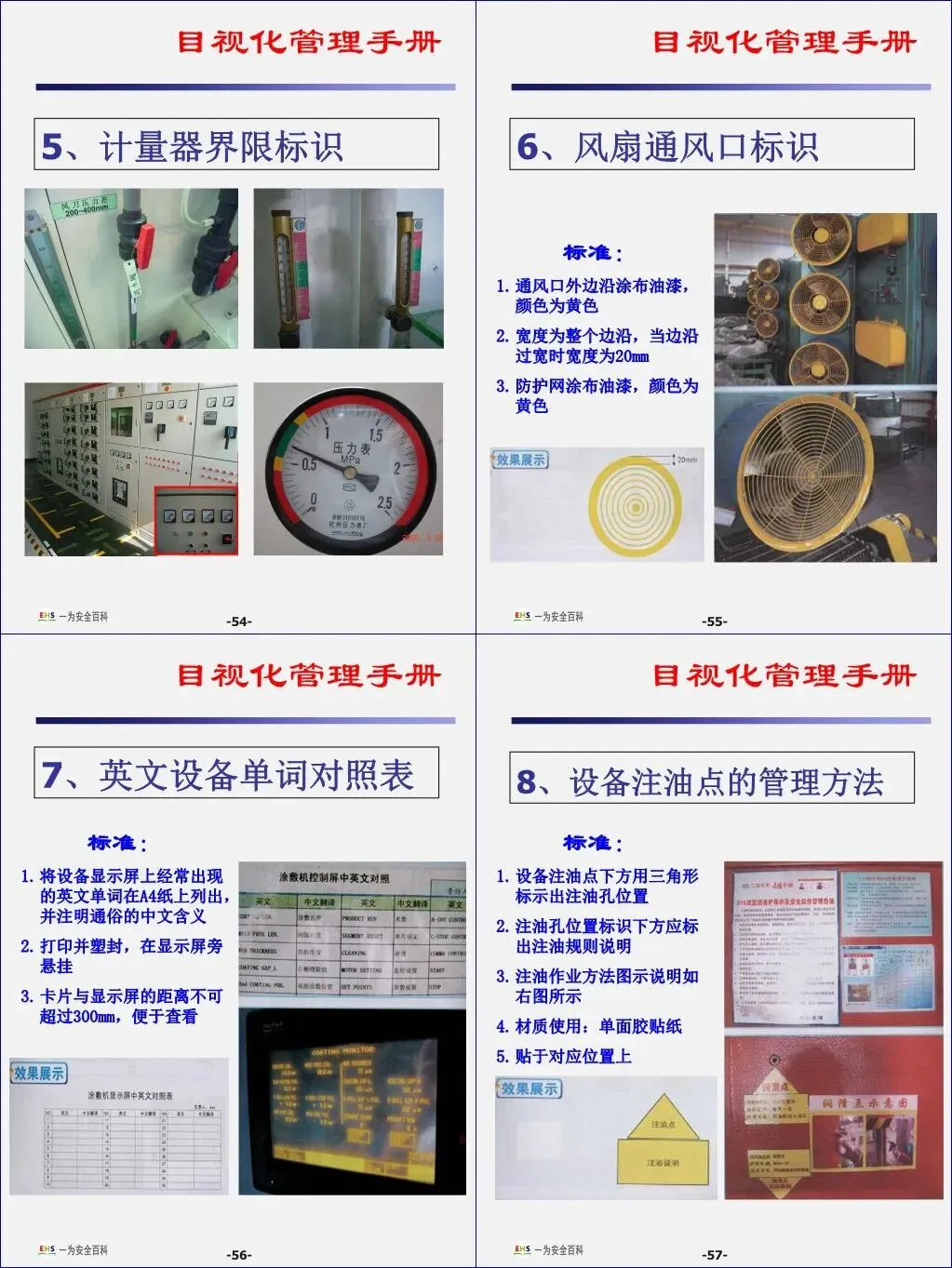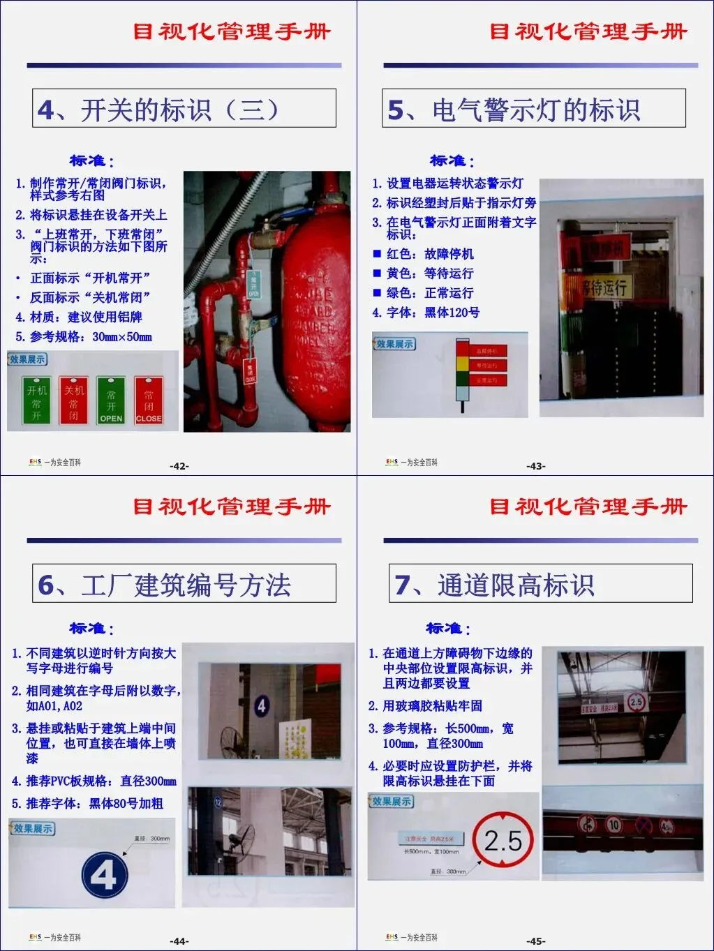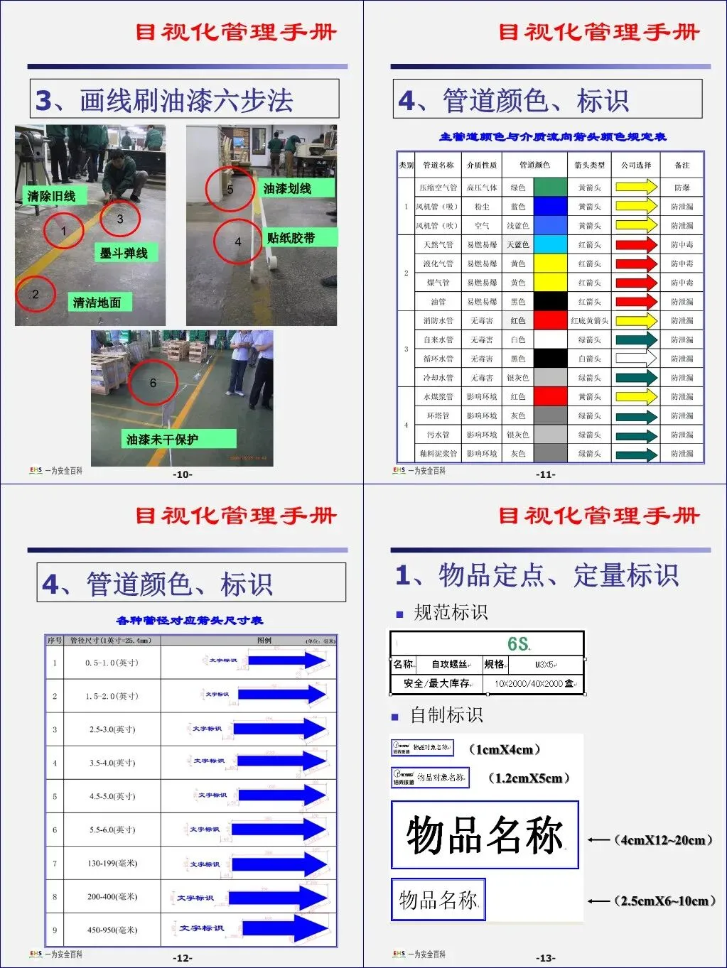 标识制作方法:提供地面划线“六步法”、管道颜色与流向箭头标准、物品定点定量标签尺寸(如1cm×4cm至4cm×20cm不等)、TPM红黄旗评价机制等实操细节。
