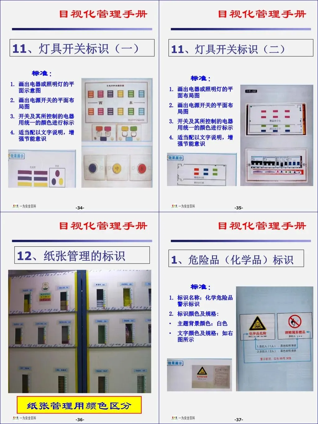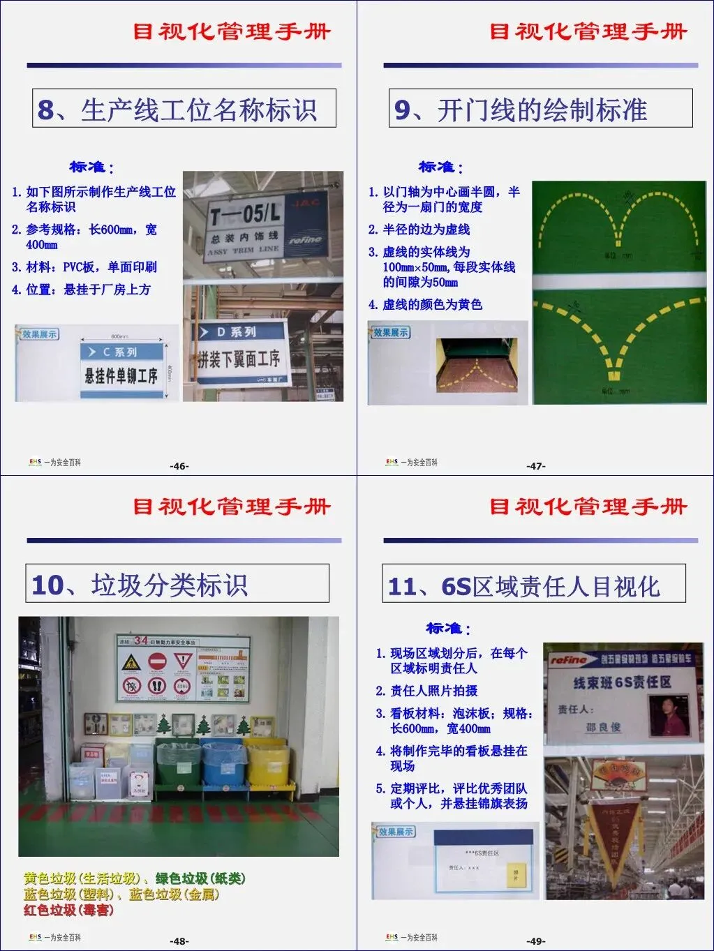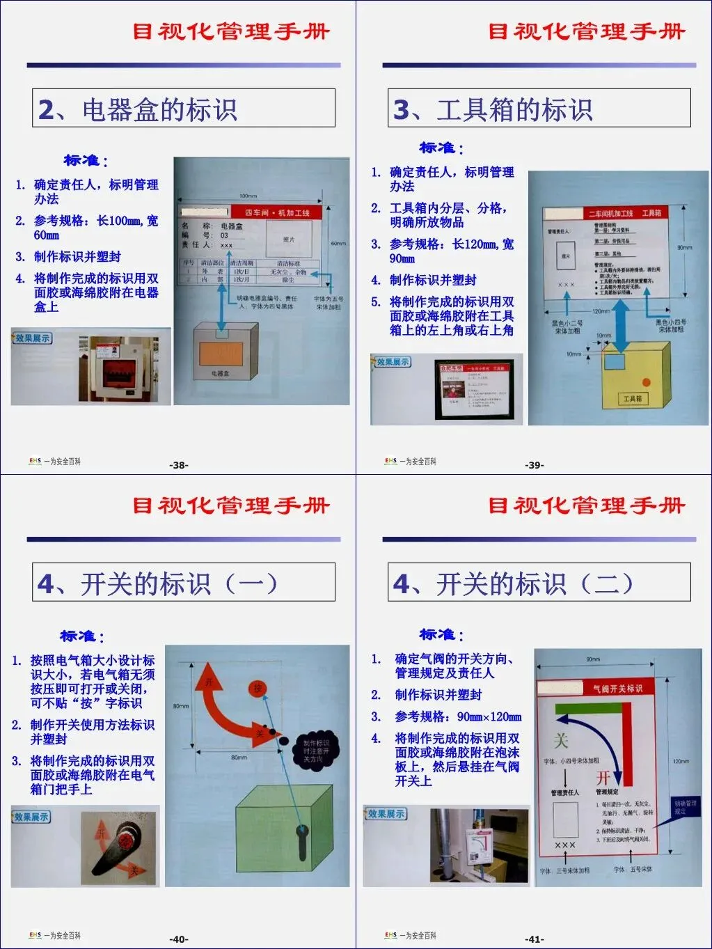 标识制作方法:提供地面划线“六步法”、管道颜色与流向箭头标准、物品定点定量标签尺寸(如1cm×4cm至4cm×20cm不等)、TPM红黄旗评价机制等实操细节。