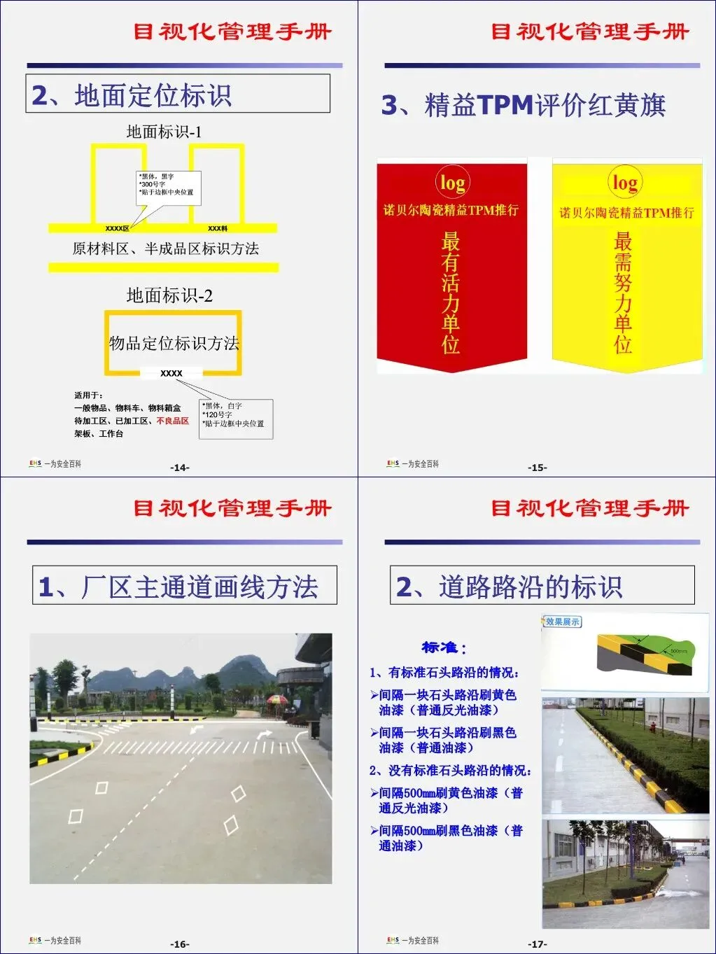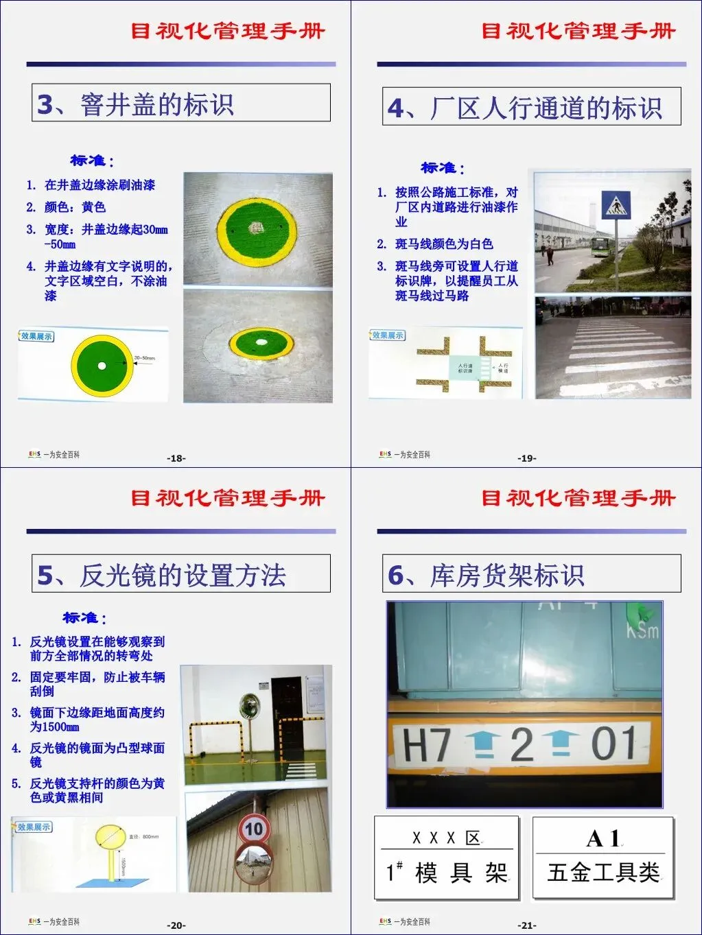 厂区与库房:包括主通道画线、路沿标识(黄黑间隔)、窨井盖涂黄边、人行斑马线、反光镜设置(凸面镜、高1500mm)、货架与物料管理。