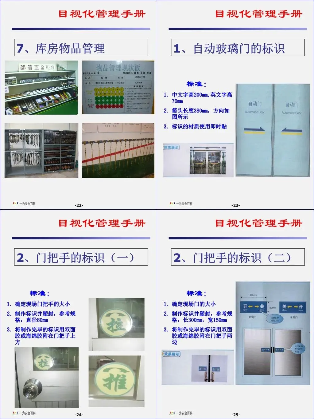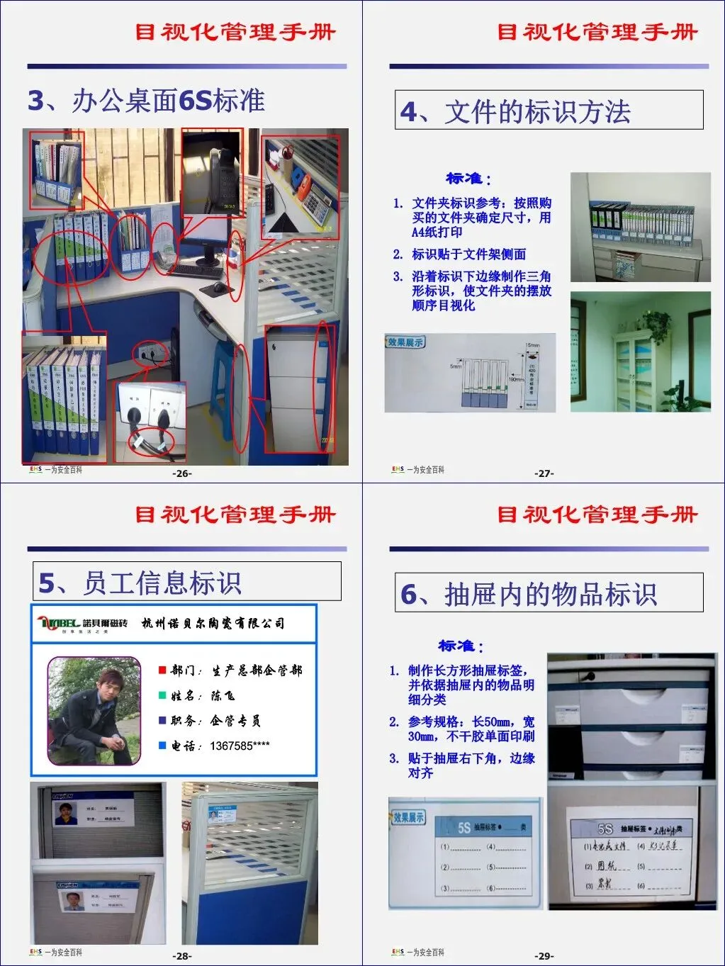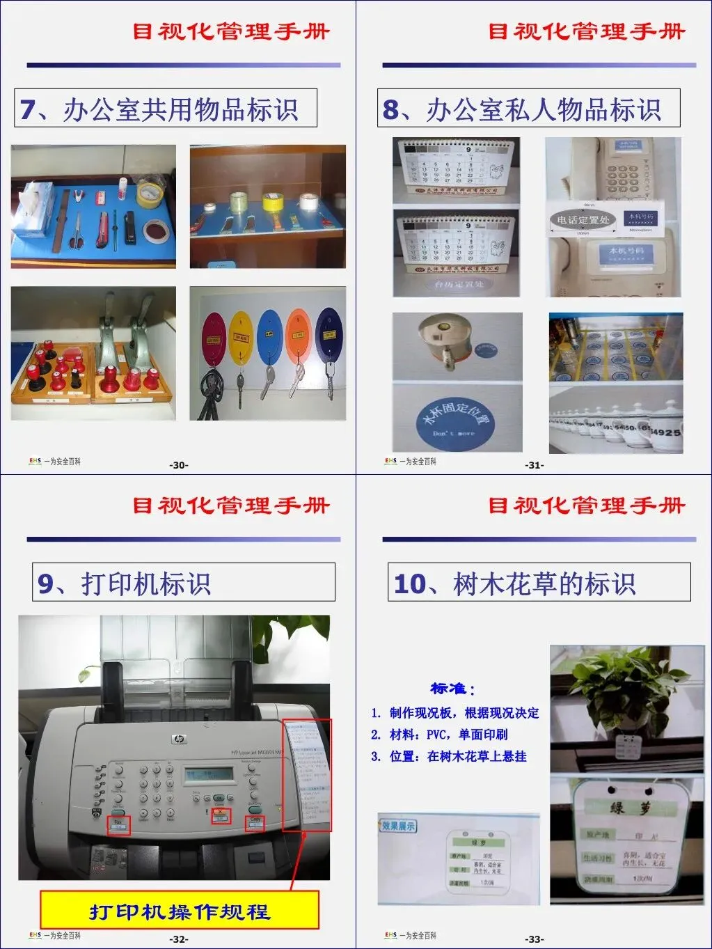 办公室:涵盖玻璃门标识(中文字高200mm)、门把手标签、办公桌面定置、文件夹侧标、抽屉内物品标签(50mm×30mm贴右下角)、共用/私人物品区分、灯具开关图示化、纸张颜色分类等。