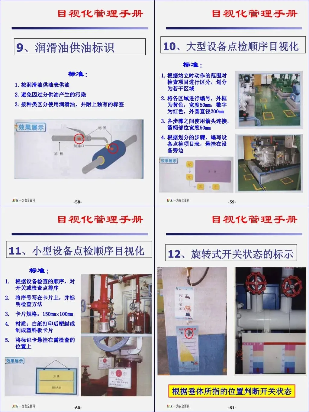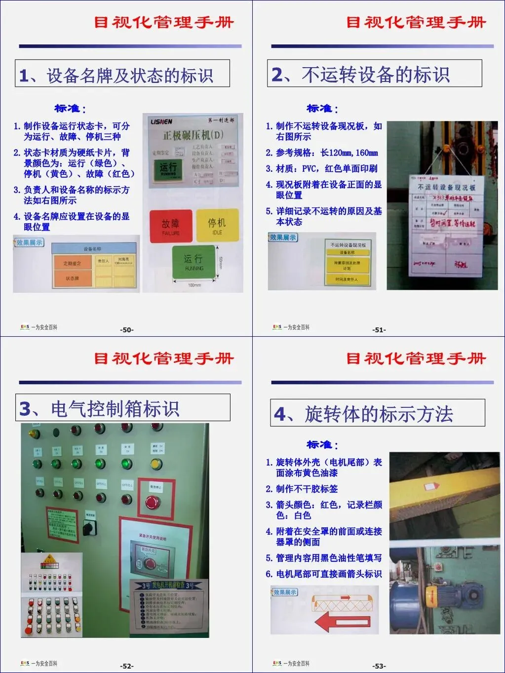 设备:运行状态卡(绿/黄/红)、不运转设备现况板、旋转体黄漆+红箭头、注油点三角形标识、大型设备点检顺序编号(黄框红字Φ200mm)、小型设备检查卡悬挂。