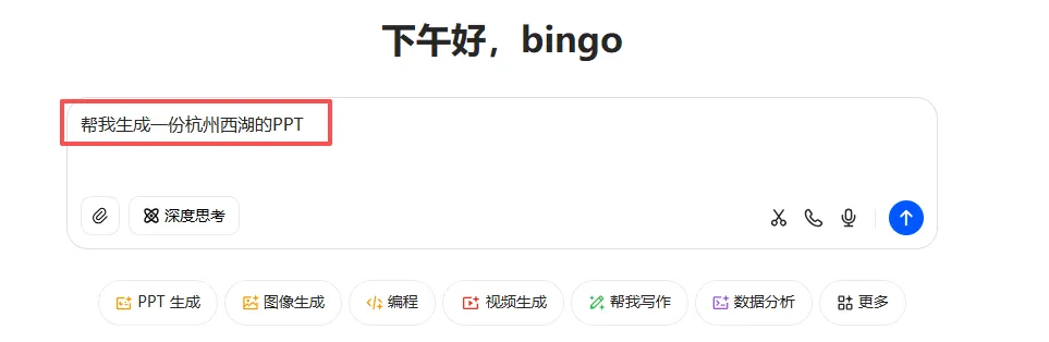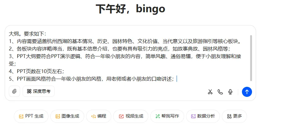 然后你就直接和豆包说:“帮我生成一份杭州西湖的PPT!”