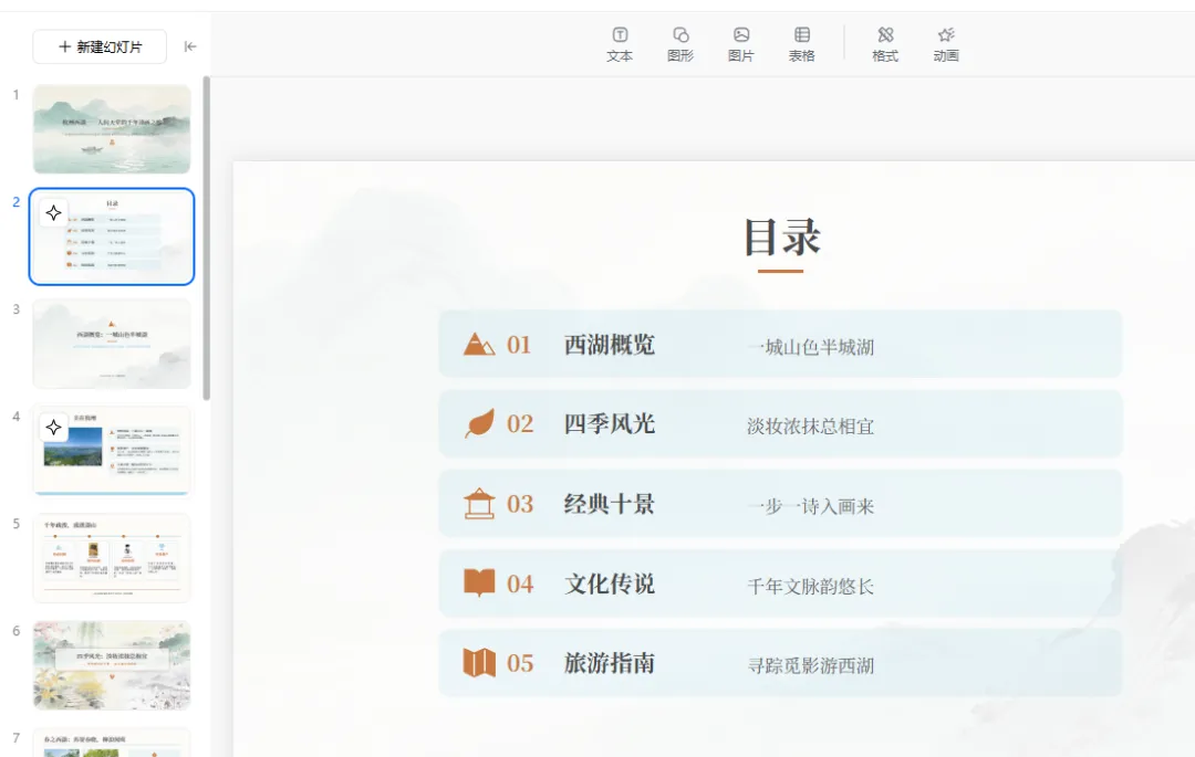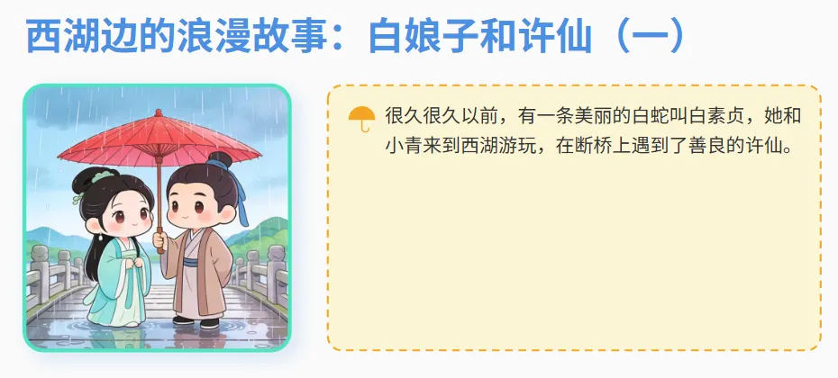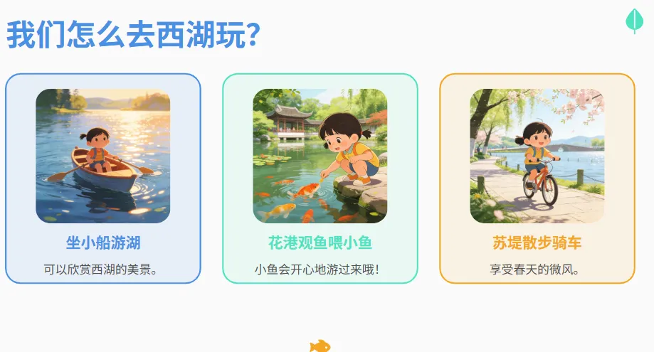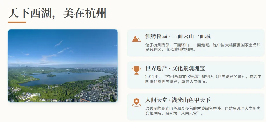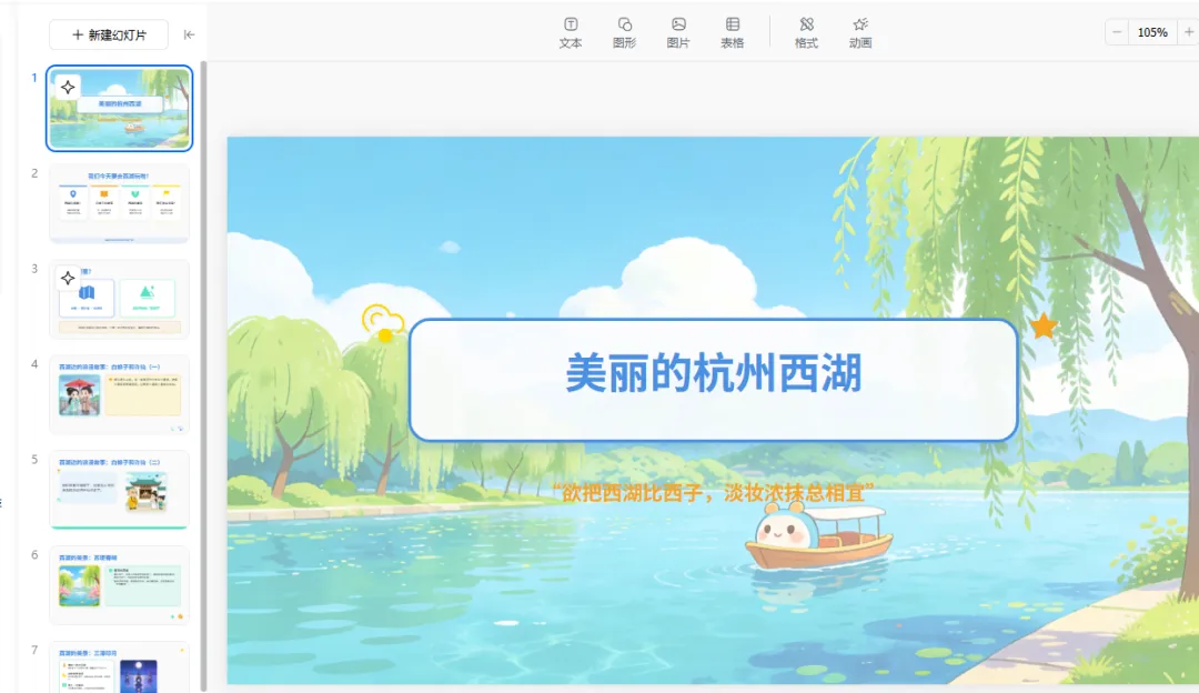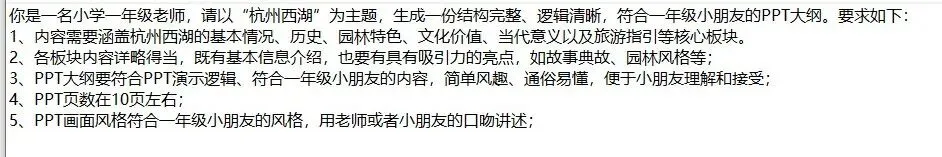 比如,你是一名一年级小学老师,你想做一份关于杭州西湖的PPT,给孩子们讲一下杭州西湖。
