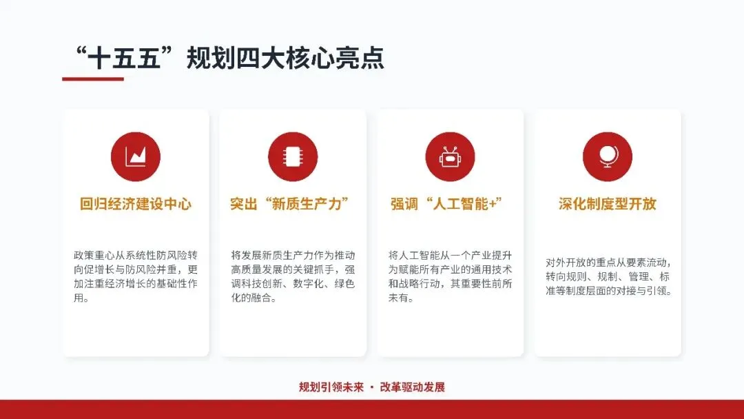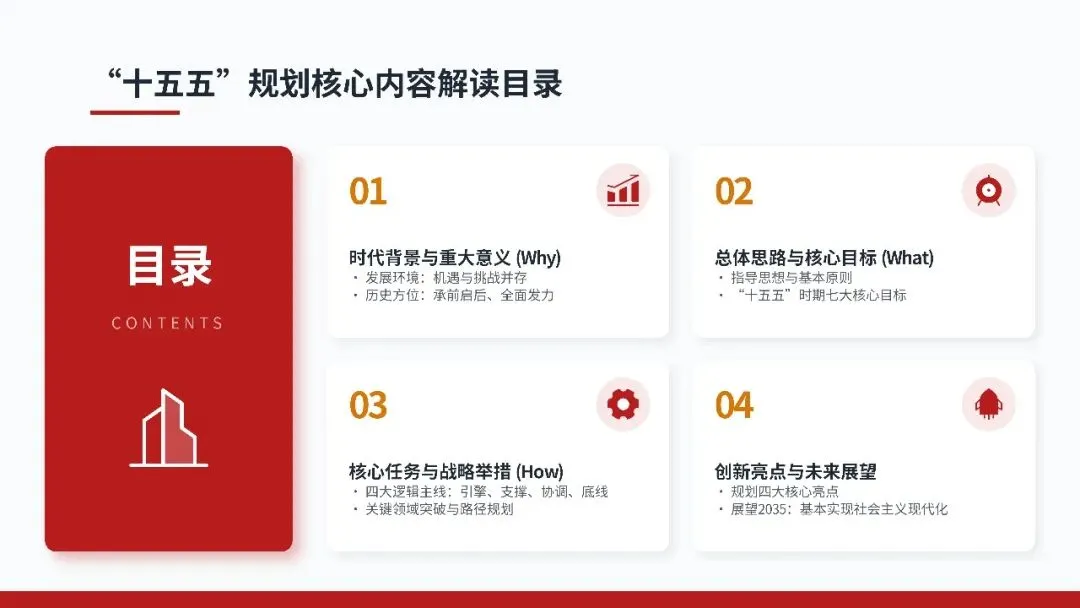 本次“十五五”规划核心内容解读分为四个部分。首先阐述时代背景与重大意义,明确发展环境与历史方位;接着说明总体思路与核心目标,涵盖指导思想、原则及七大核心目标;然后介绍核心任务与战略举措,包括四大逻辑主线和关键领域突破;最后分享创新亮点与未来展望,助力实现2035远景目标。