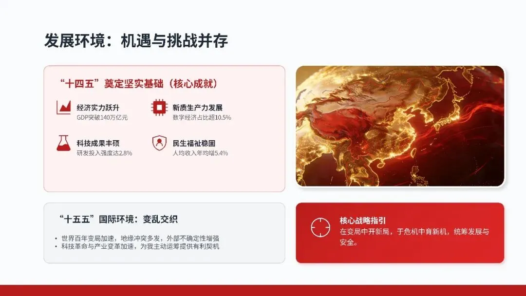“十四五”为“十五五”奠定坚实基础,经济实力跃升、新质生产力发展、科技成果丰硕、民生福祉稳固。“十五五”国际环境变乱交织,虽有地缘冲突等不确定性,但科技革命与产业变革也带来契机。我们要在变局中开新局,统筹发展与安全。